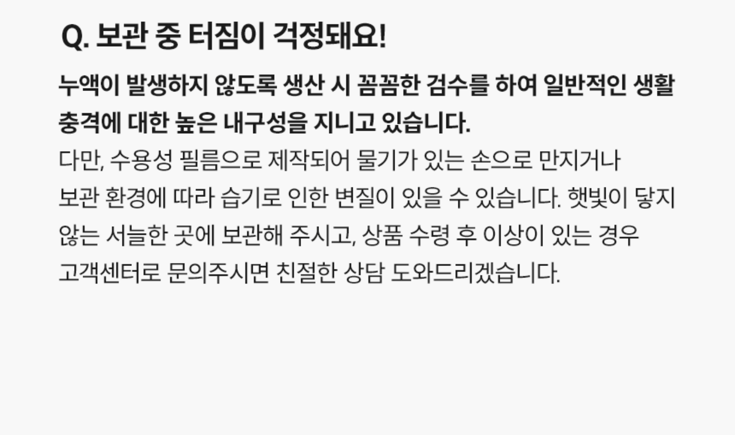 - 가격, 판매자, 교환/환불 및 배송 등 해당 상품 자체와 관련 없는 문의는 고객센터 내 1:1 문의하기를 이용해주세요.