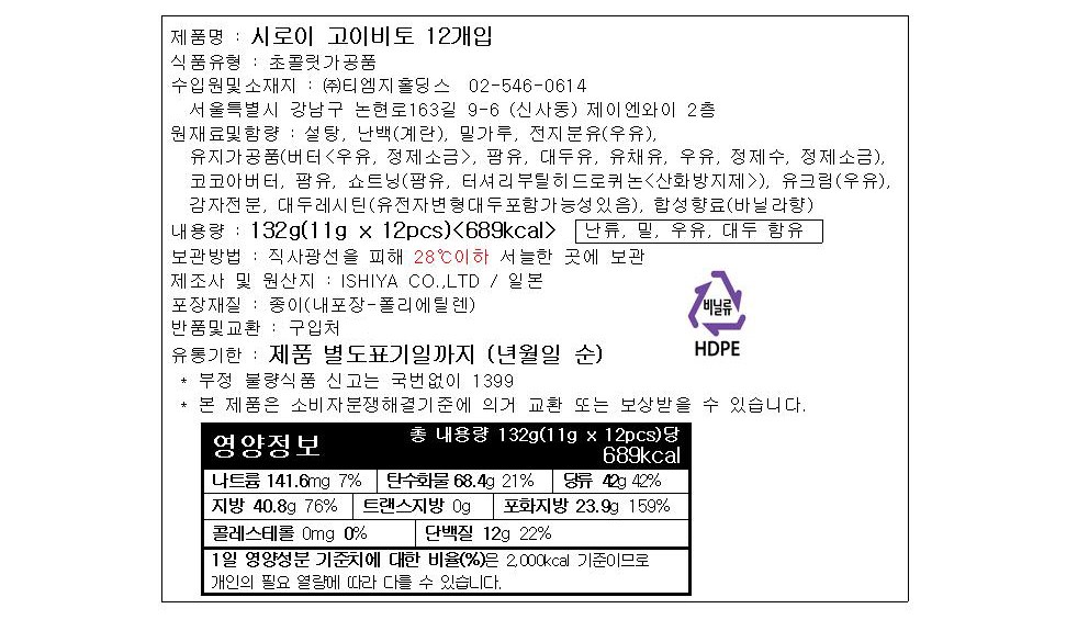 | 제품명 | 시로이 고이비토 12개입 | 식품의 유형 | 컨텐츠 참조 |