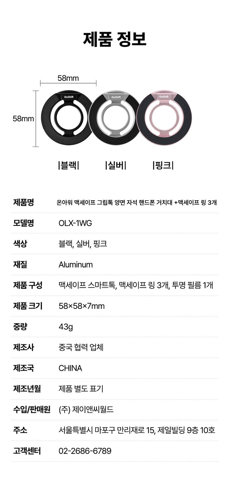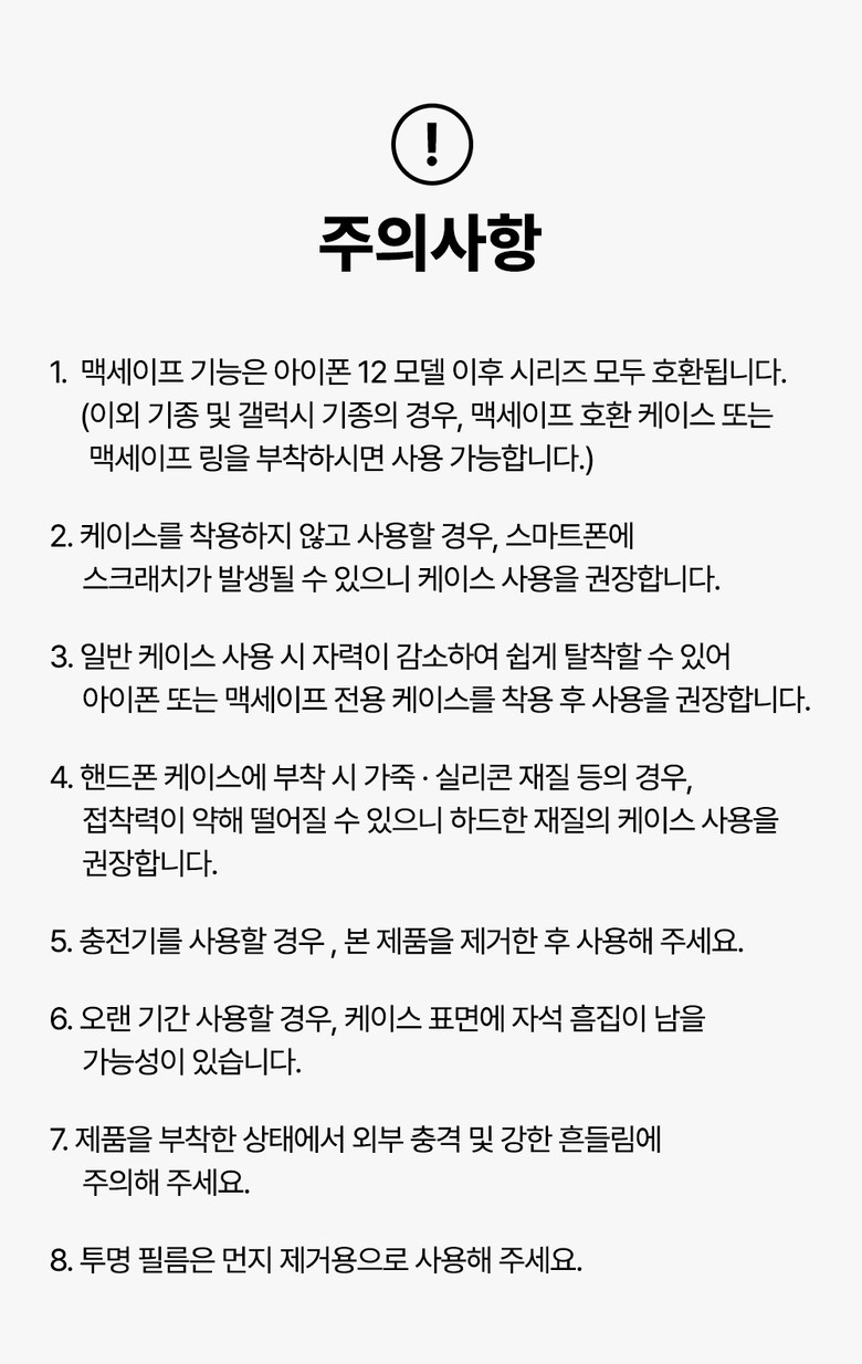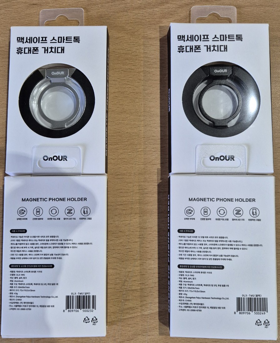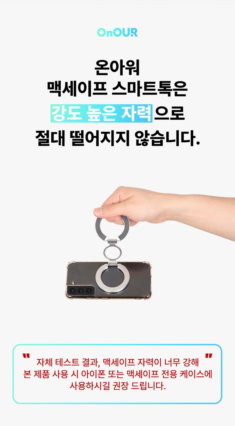 | 품명 및 모델명 | 온아워 맥세이프 그립 스마트톡 휴대폰 거치대 + 맥세이프링 3P | 인증/허가 사항 | 해당없음(14세 이상) |