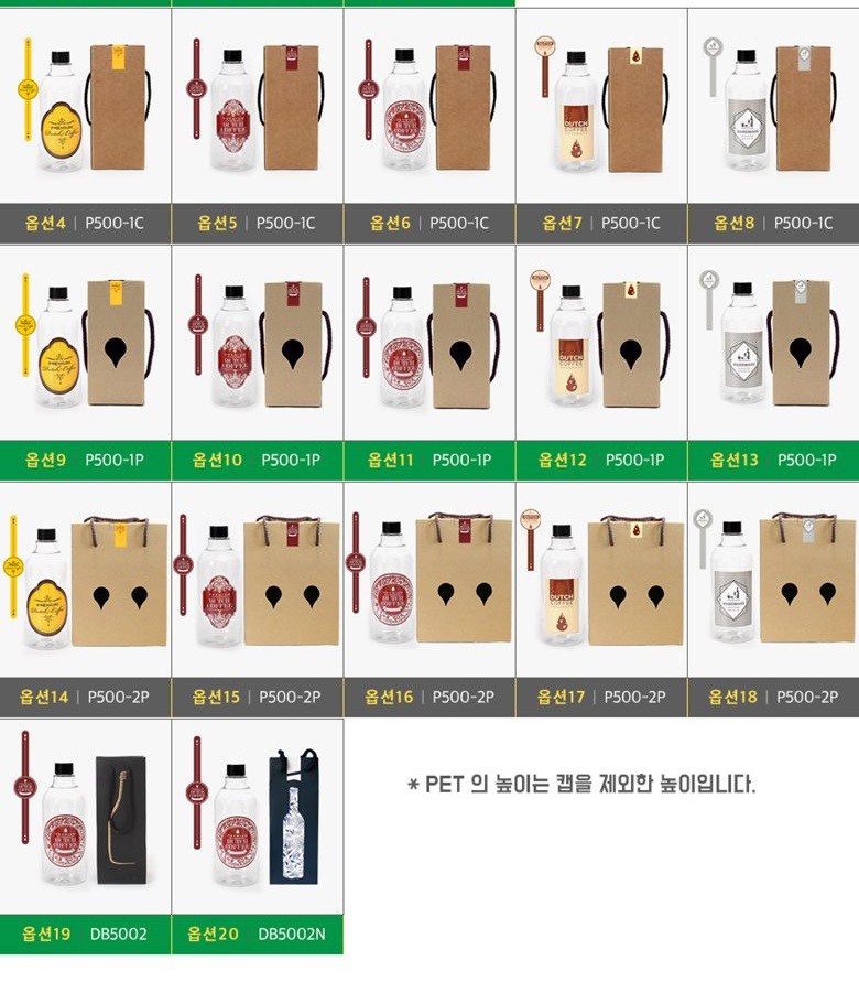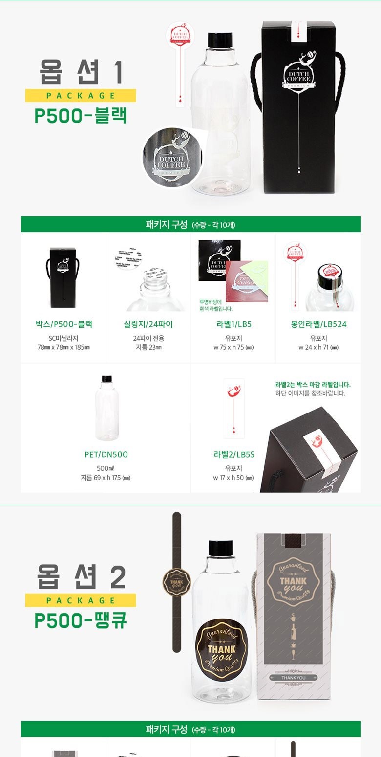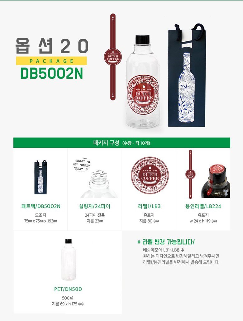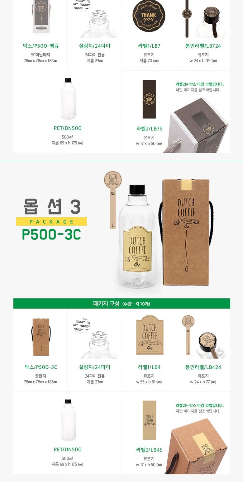 | 구성품 | 1set*10개 구성 : 페트병10개+쇼핑백10개+실링지10개+라벨1-10개+라벨2-10개+봉인라벨10개 | 크기 | 박스 (75 x 75 x 193mm), 실링지 (23mm), 라벨1 (80mm), 봉인라벨 (24 x 119mm), PET (500ml, 69 x 175mm), 라벨2 (17 x 50mm) |