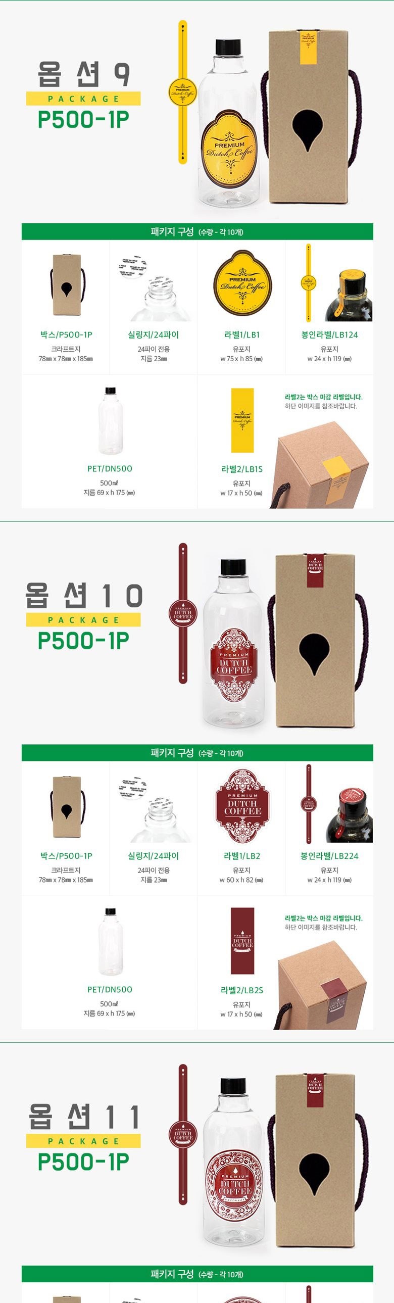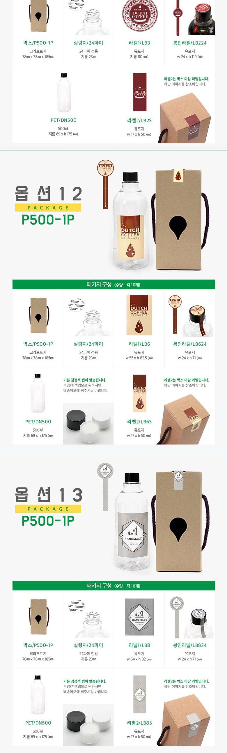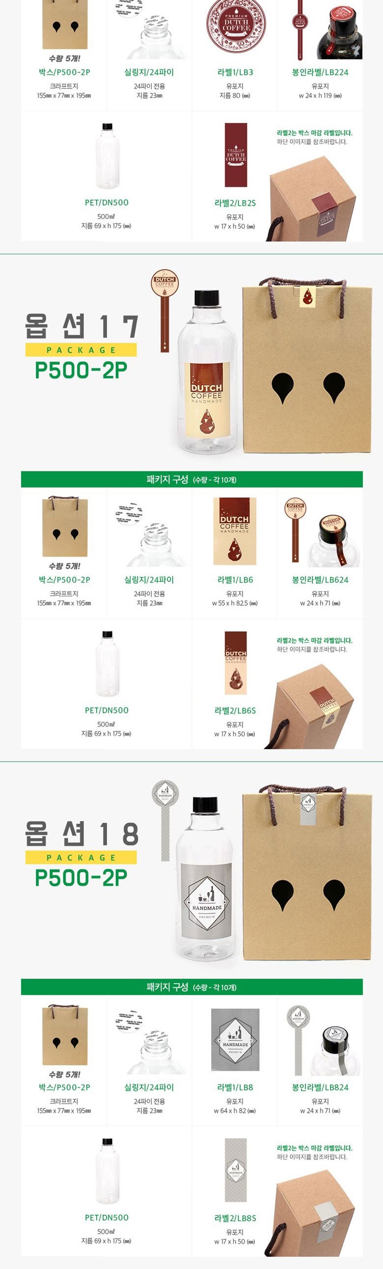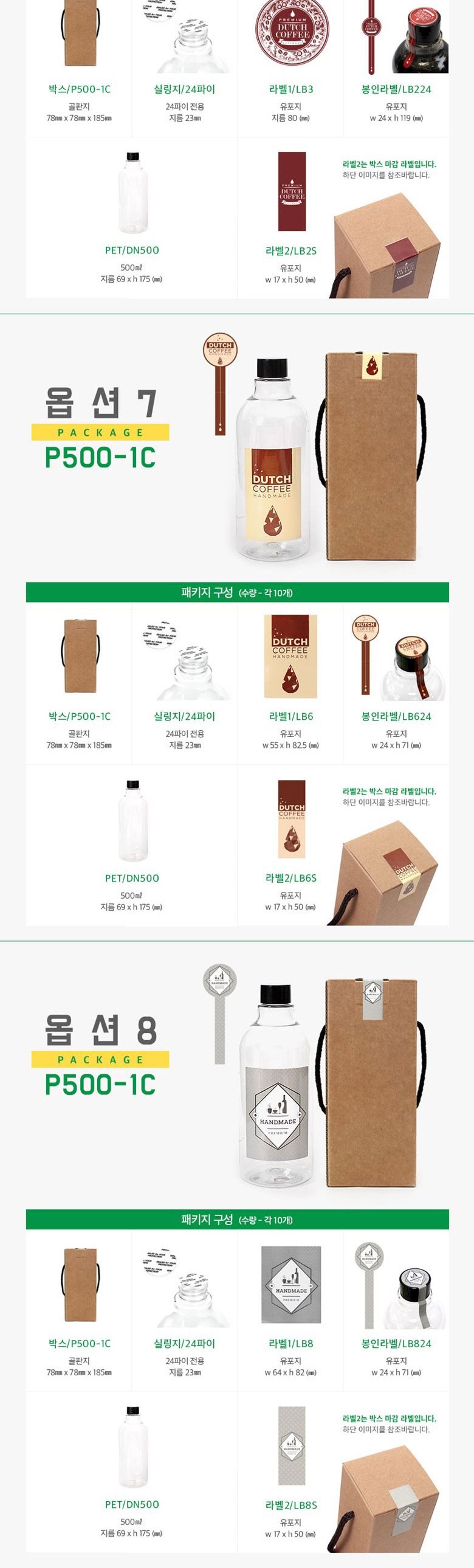 | 구성품 | 1set*10개 구성 : 페트병10개+쇼핑백10개+실링지10개+라벨1-10개+라벨2-10개+봉인라벨10개 | 크기 | 박스 (75 x 75 x 193mm), 실링지 (23mm), 라벨1 (80mm), 봉인라벨 (24 x 119mm), PET (500ml, 69 x 175mm), 라벨2 (17 x 50mm) |