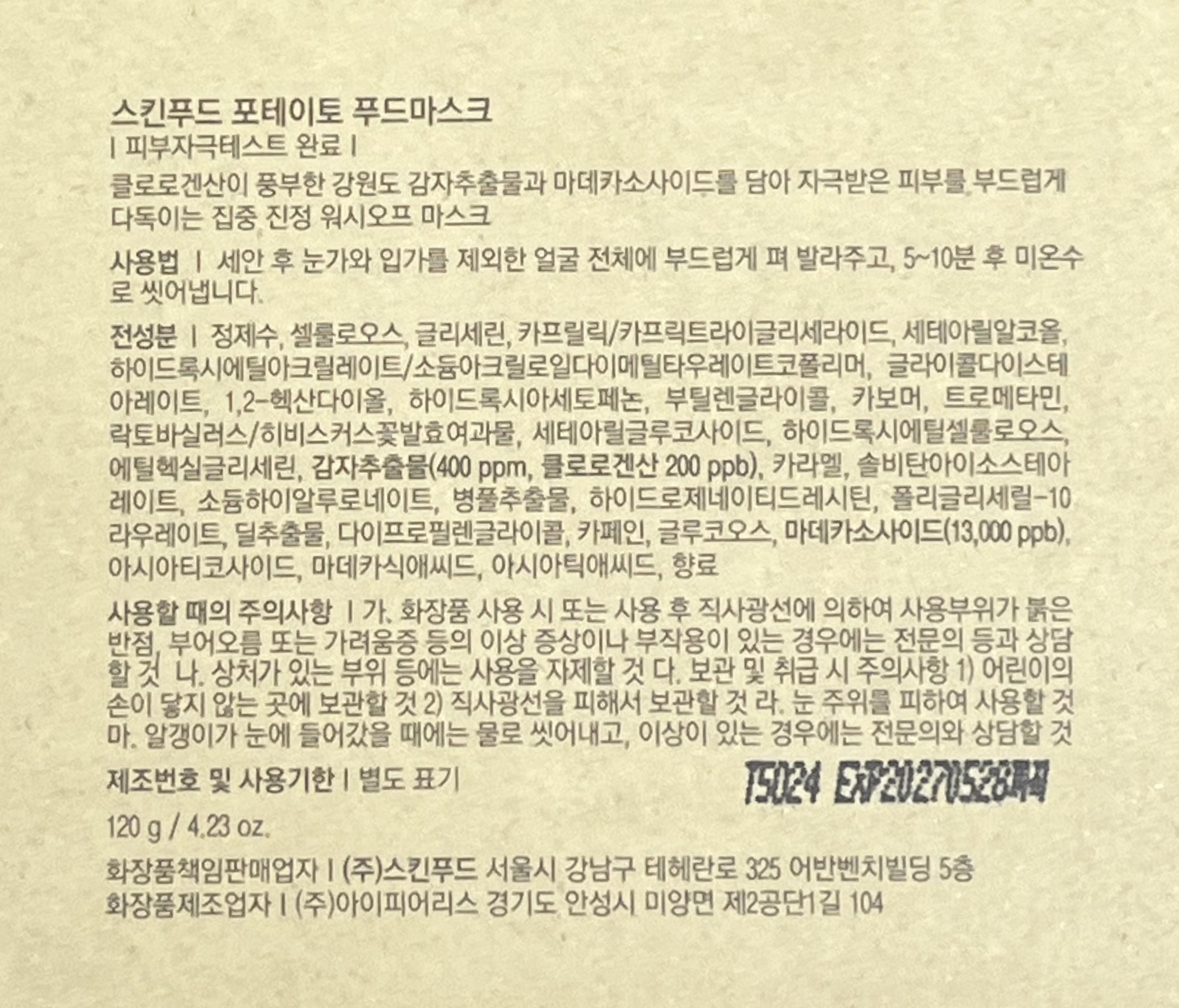 | 화장품제조업자, 화장품책임판매업자 및 맞춤형화장품판매업자 | 컨텐츠 참조 | 제조국 | 대한민국 |