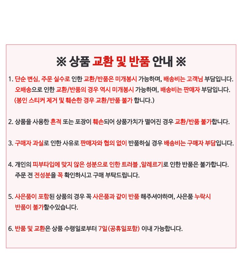 | 교환/반품 신청 기준일 | ㆍ단순변심에 의한 교환/반품은 제품 수령 후 7일 이내까지, 교환/반품 제한사항에 해당하지 않는 경우에만 가능 (배송비용과 교환/반품 비용 왕복배송비 고객부담) ㆍ상품의 내용이 표시·광고의 내용과 다른 경우에는 상품을 수령한 날부터 3개월 이내, 그 사실을 안 날 또는 알 수 있었던 날부터 |