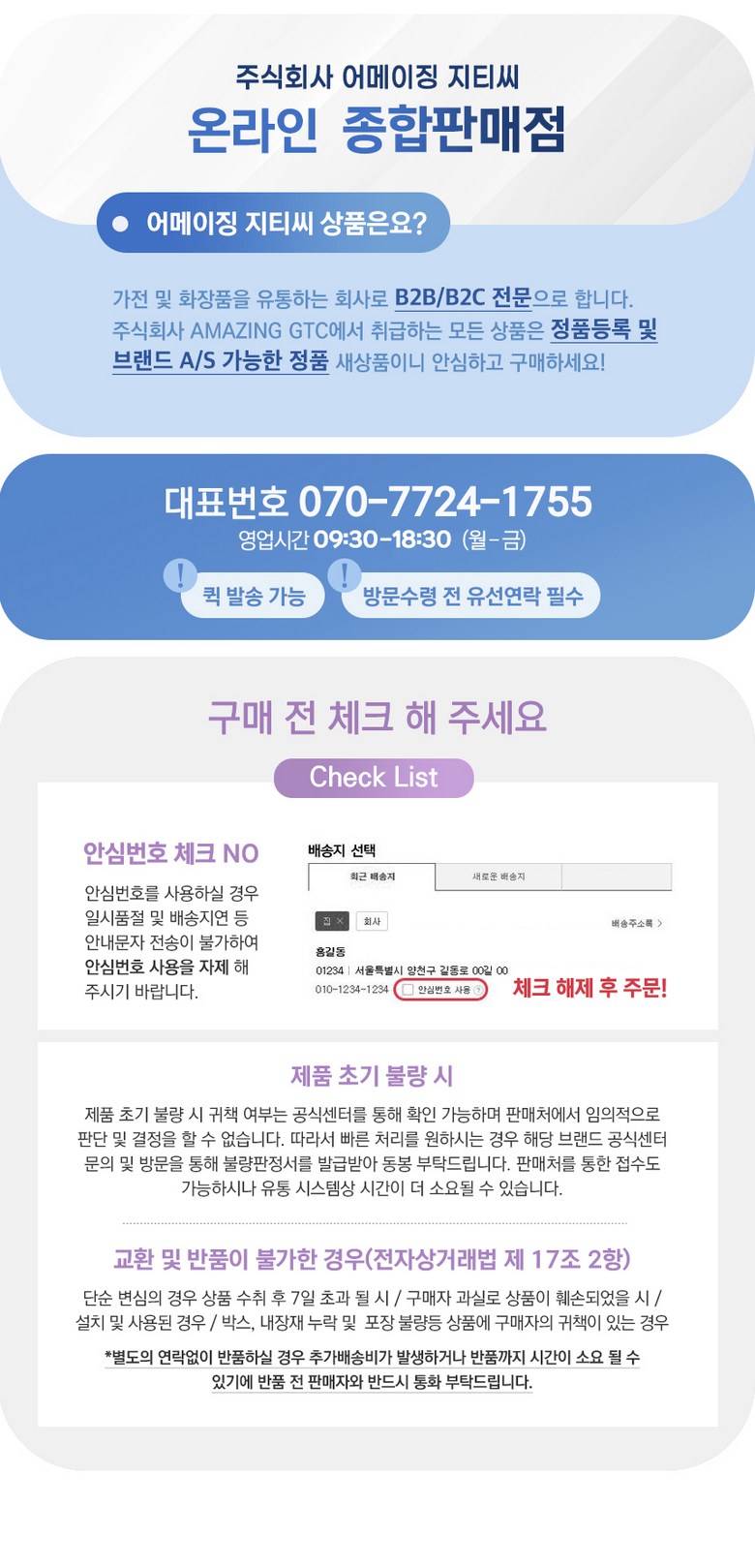 - ㆍ교환/반품에 관한 일반적인 사항은 판매자가 제시사항보다 관계법령이 우선합니다.