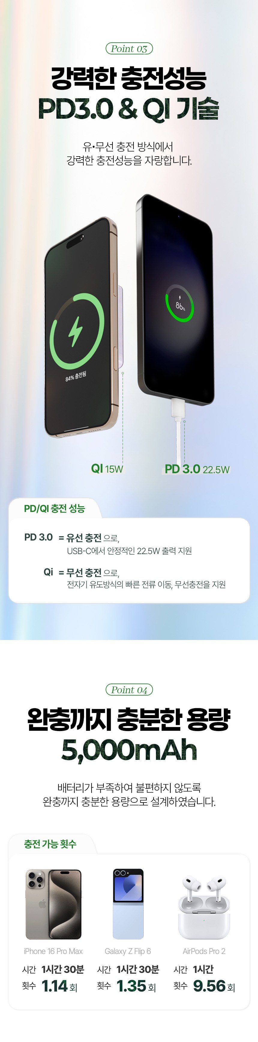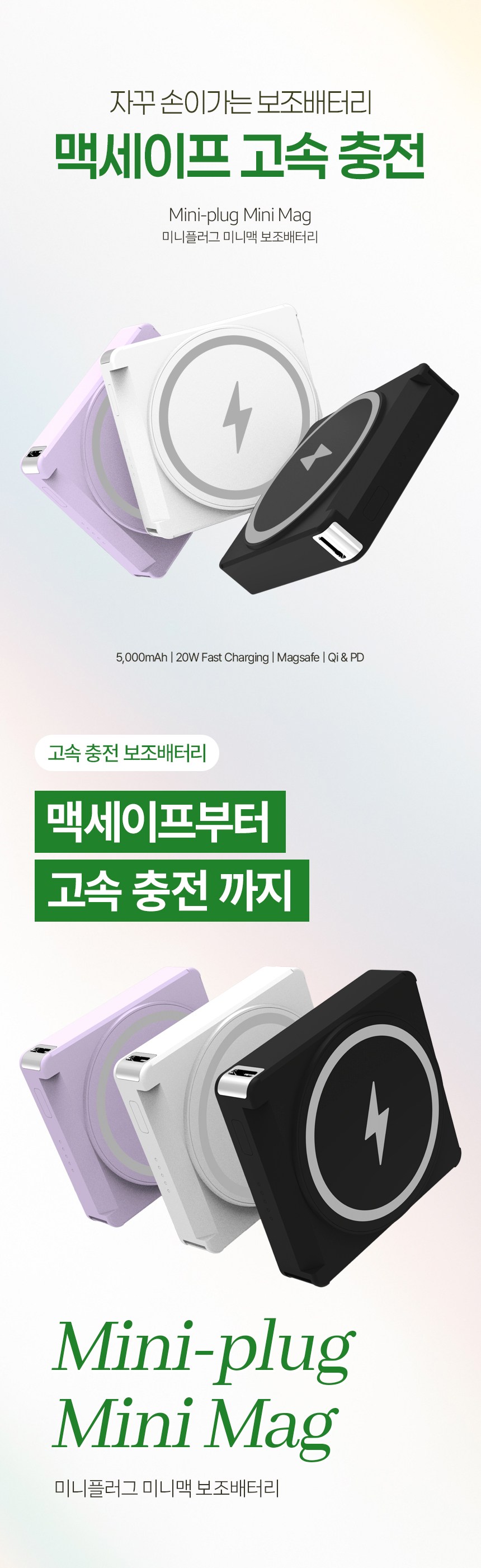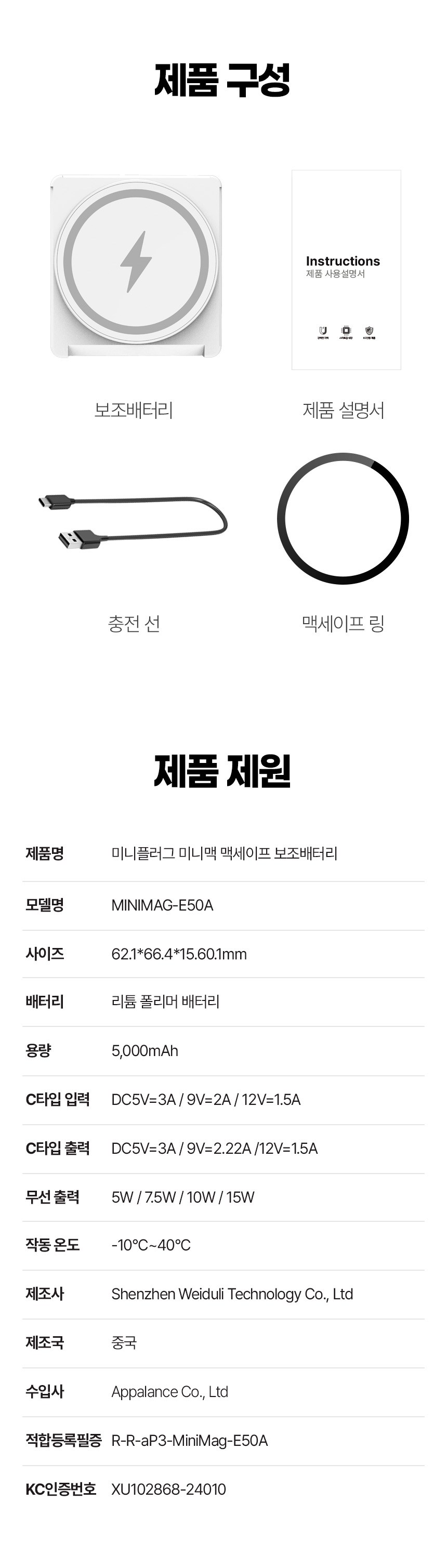 | 품명 및 모델명 | 무선충전 보조배터리 / MiniMag-E50A, MiniMag-5000-E50A | KC 인증정보 | R-R-aP3-MiniMag-E50A, XU102868-24010 |