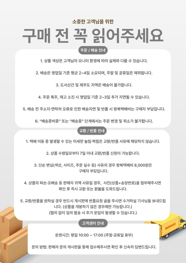 - ㆍ모니터 해상도의 차이로 인해 색상이나 이미지가 실제와 달라, 고객이 단순 변심으로 교환/반품을 무료로 요청하는 경우