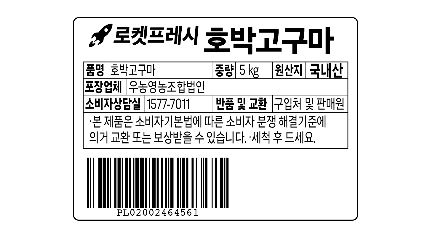 | 품목 또는 명칭 | 호박고구마 5kg(특상), 박스_PL_vege | 포장단위별 내용물의 용량(중량),수량,크기 | 5kg |