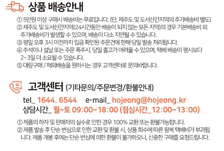 - ㆍ모니터 해상도의 차이로 인해 색상이나 이미지가 실제와 달라, 고객이 단순 변심으로 교환/반품을 무료로 요청하는 경우