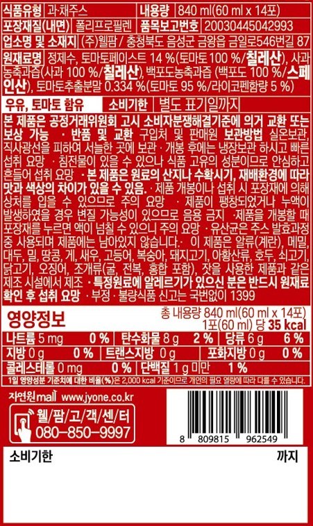 | 포장단위별 내용물의 용량(중량), 수량 | 60ml*14개 | 원재료명 및 함량 | 컨텐츠 참조 |