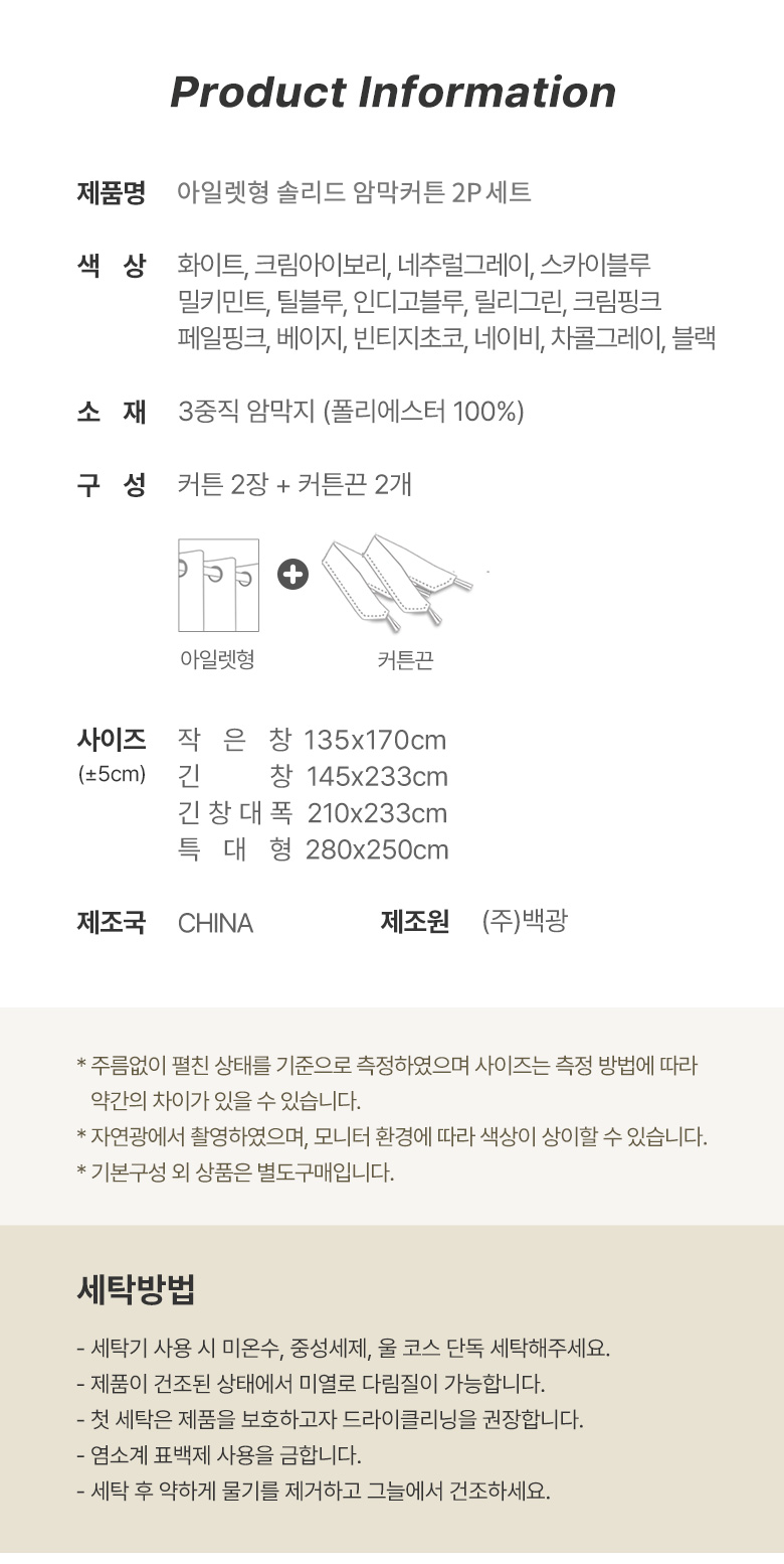 | 치수 | 암막커튼 작은창 : 135X170cm, 커튼끈 : 5.5X47cm | 제품구성 | 암막커튼 작은창(135X170cm) 2개, 커튼끈 2개 |
