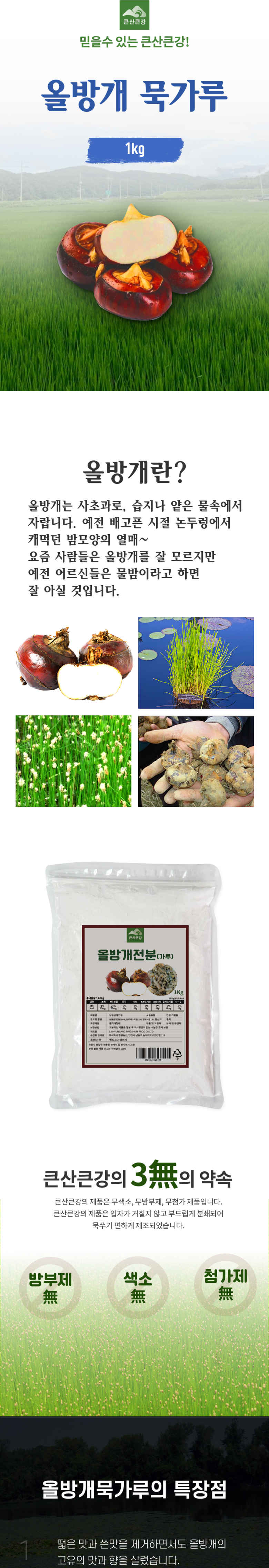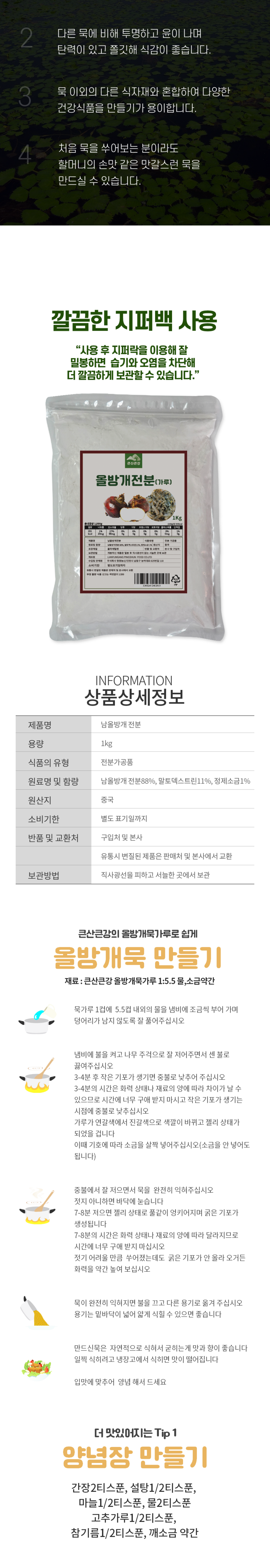| 포장단위별 내용물의 용량(중량), 수량 | 1kg | 원재료명 및 함량 | 남올방개 전분 88%,말토덱스트린 11%,정제소금 1% |