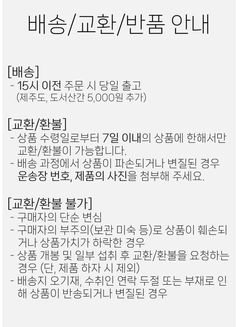 | 배송기간 | ㆍ도서산간 지역 등은 배송에 3-5일이 더 소요될 수 있습니다. - 천재지변, 물량 수급 변동 등 예외적인 사유 발생 시, 다소 지연될 수 있는 점 양해 부탁드립니다. | ||