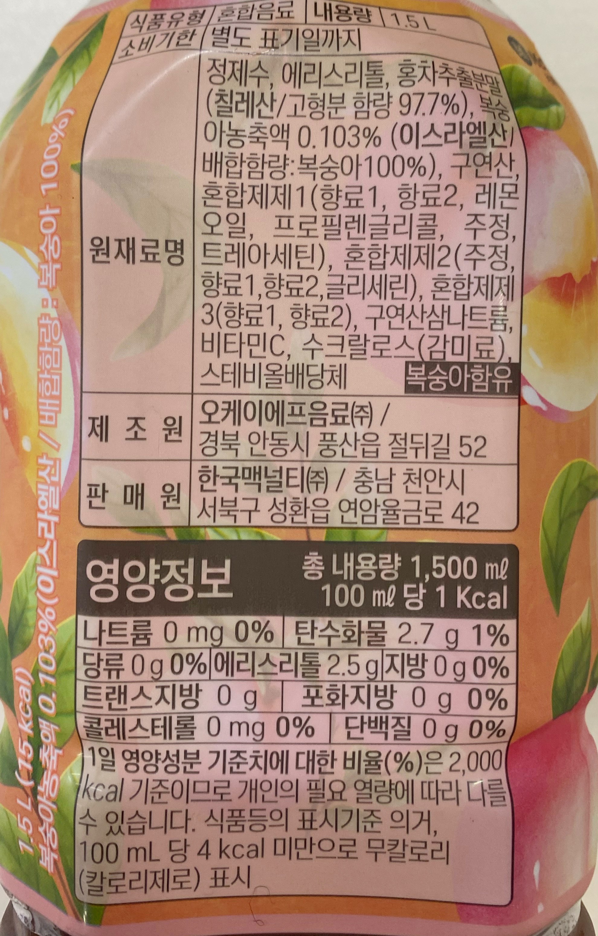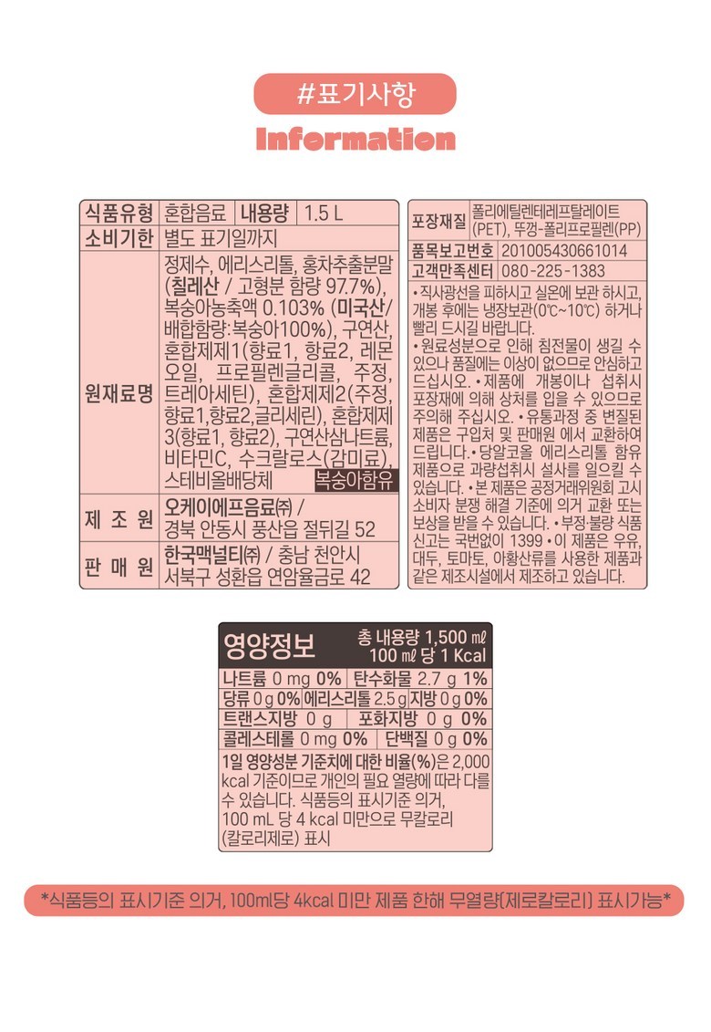 | 제품명 | 복숭아 아이스티 제로 | 식품의 유형 | 컨텐츠 참조 |