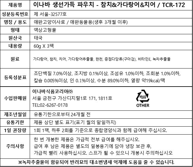 | 품명 및 모델명 | 이나바 생선가득 파우치 - 참치 & 가다랑어 & 치어 /TCR-172 | 인증/허가 사항 | 사료관리법에 따른 성분등록번호 : 컨텐츠 참조 |