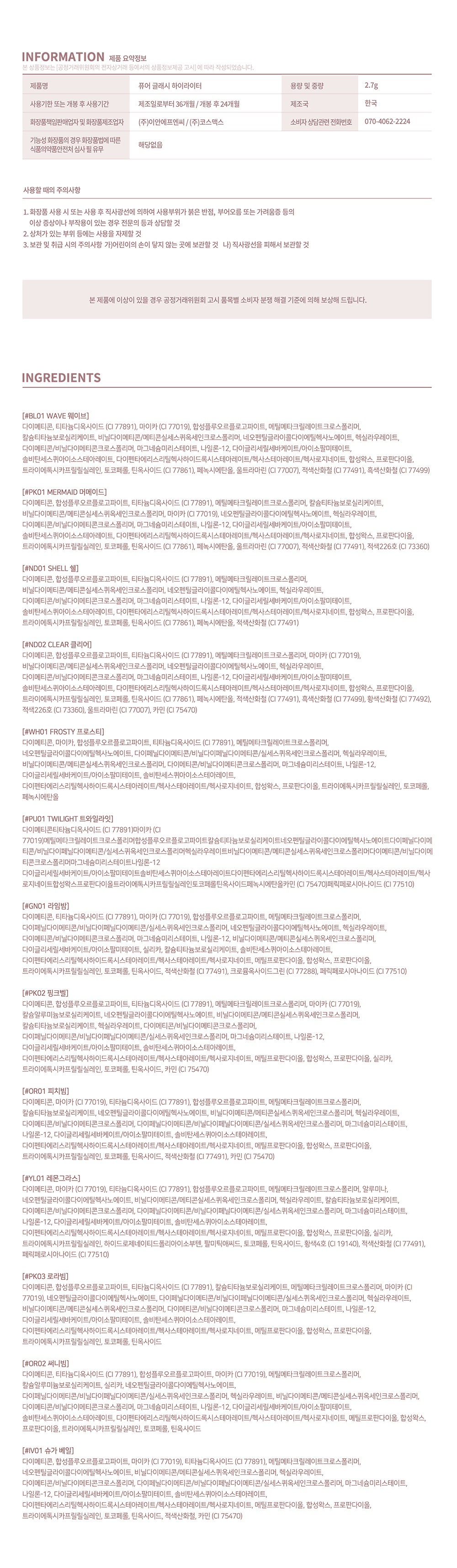 | 사용기한 또는 개봉 후 사용기간 | 본 상품은 해당 물류센터 직발송 상품인 관계로 제조연월일 및 사용기한 정보가 매번 변경되므로 상단 사용기한 정보를 참고해 주세요. | 사용방법 | 손이나 브러시에 적당향을 취한 후 자연스럽게 눈에 펴 바릅니다. |