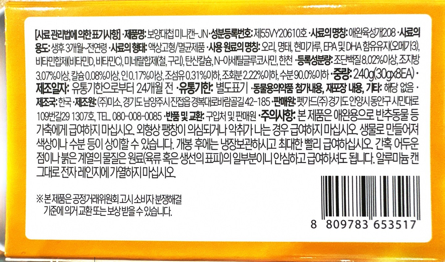 | 품명 및 모델명 | 보양대첩 미니캔-JN | 인증/허가 사항 | 사료관리법에 따른 성분등록번호 : 컨텐츠 참조 |