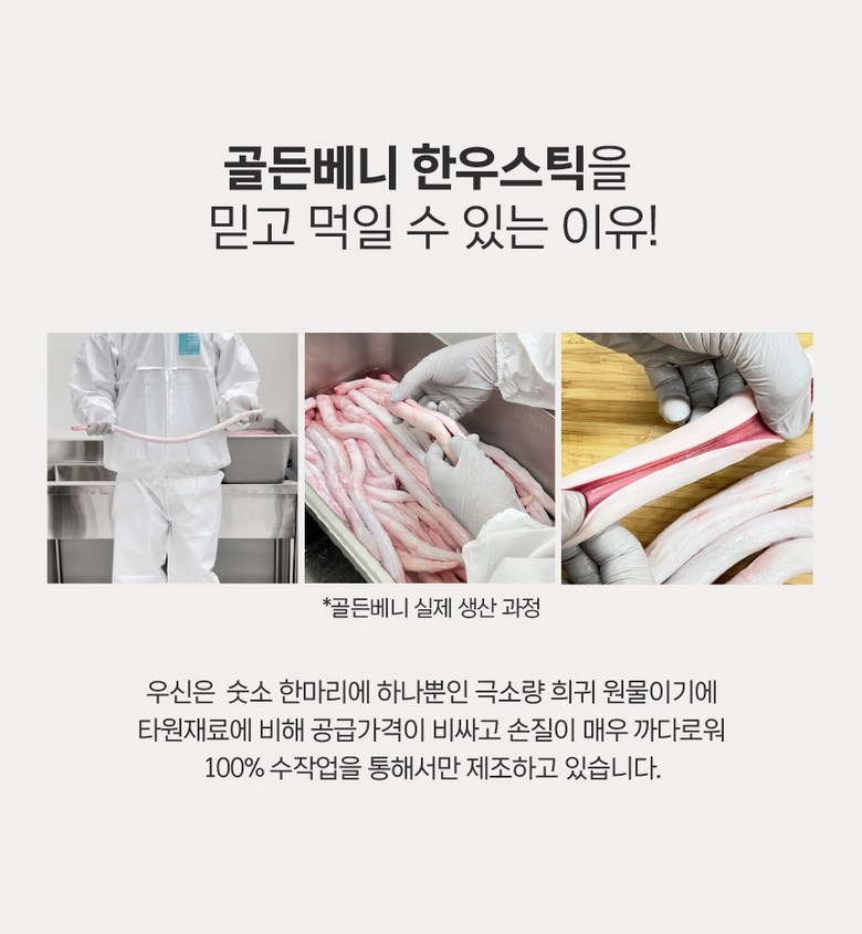 "골든베니 한우스틱은 신선하고 안전한 국내산 소우신만 사용하여 만듭니다"