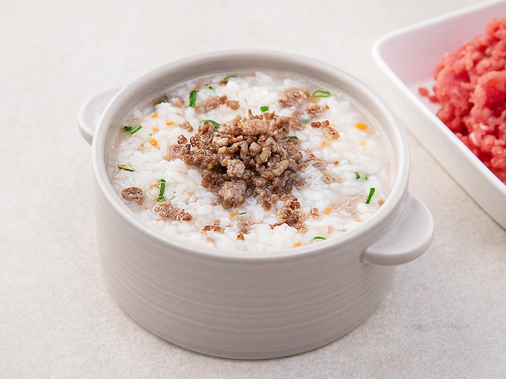 재료: 쌀 80 g, 소고기 다짐육 60 g, 당근 10 g, 육수 400 ml