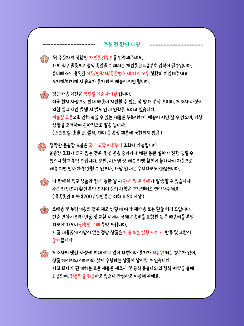 - 법규 개정에 따라 개인통관고유부호 검증 절차가 강화되었습니다. 결제 단계에서 받는 사람의 정보가 관세청 등록 정보 (성명, 휴대폰, 개인통관고유부호, 주소) 와 일치하는지 확인해주세요.