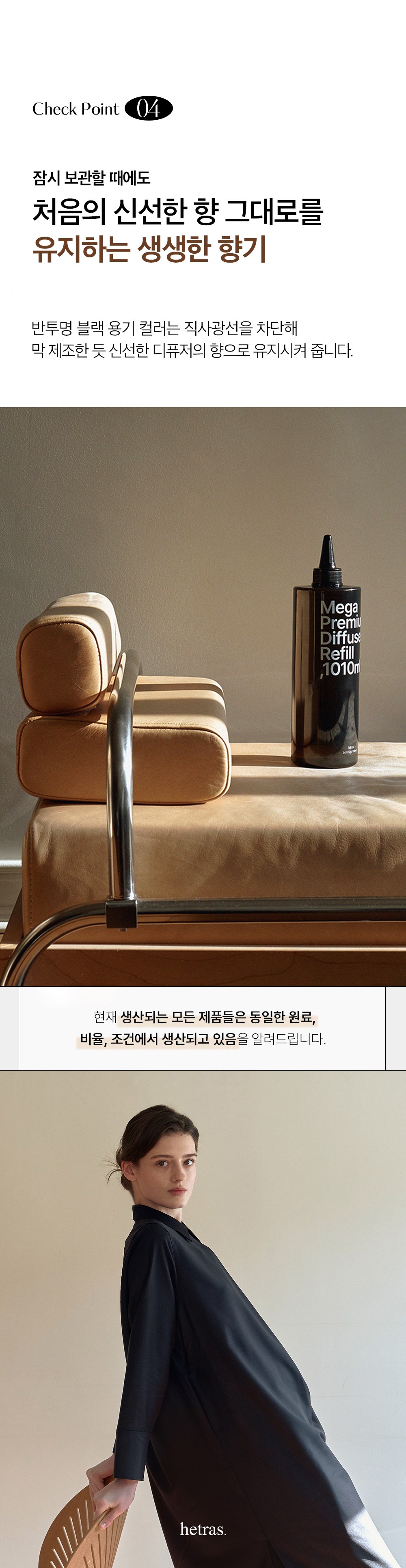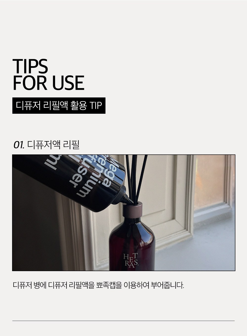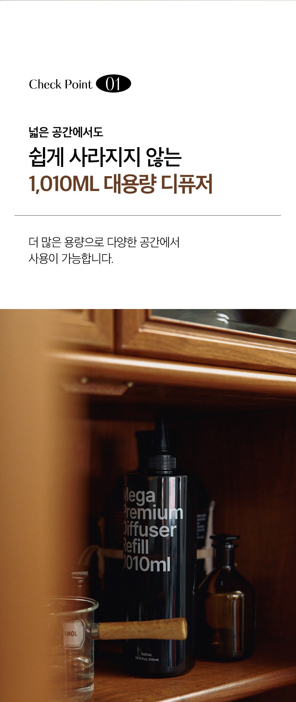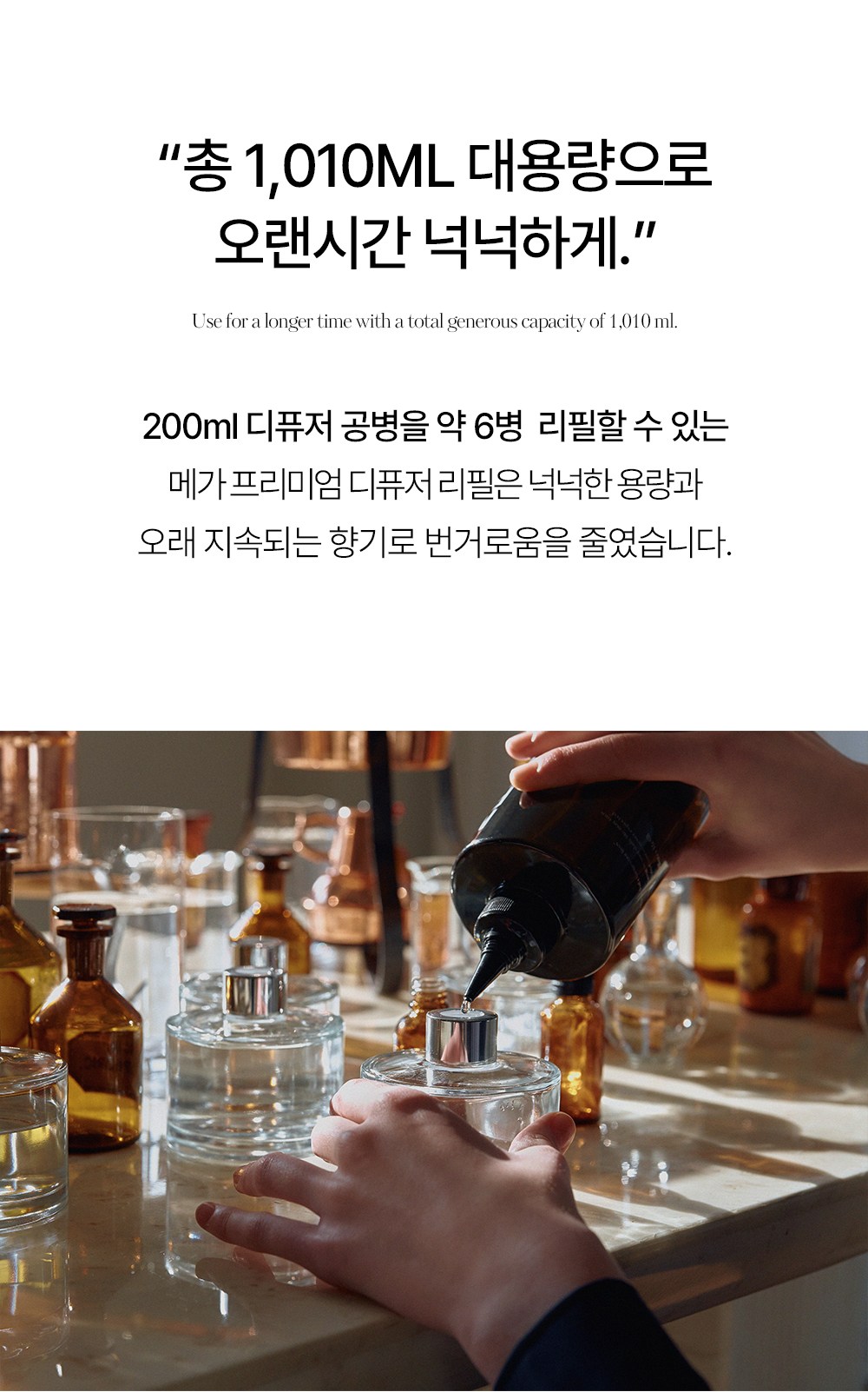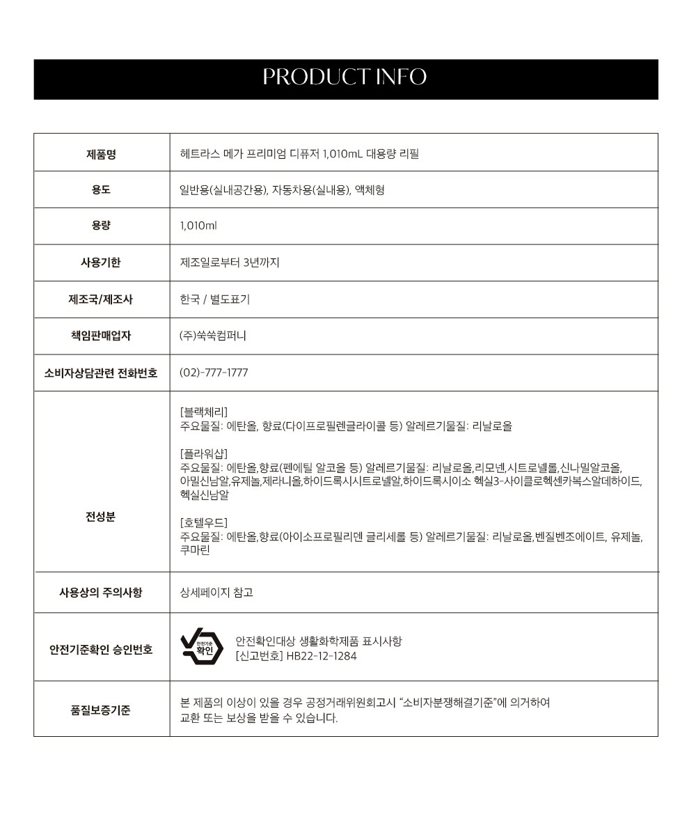| 품목 및 제품명 | 방향제 / 헤트라스 메가 프리미엄 디퓨저 1,010mL 대용량 리필 - 호텔우드 | 용도(표백제의 경우 계열을 함께표시) 및 제형 | 일반용 (실내공간용), 자동차용 (실내용) / 액체형 |