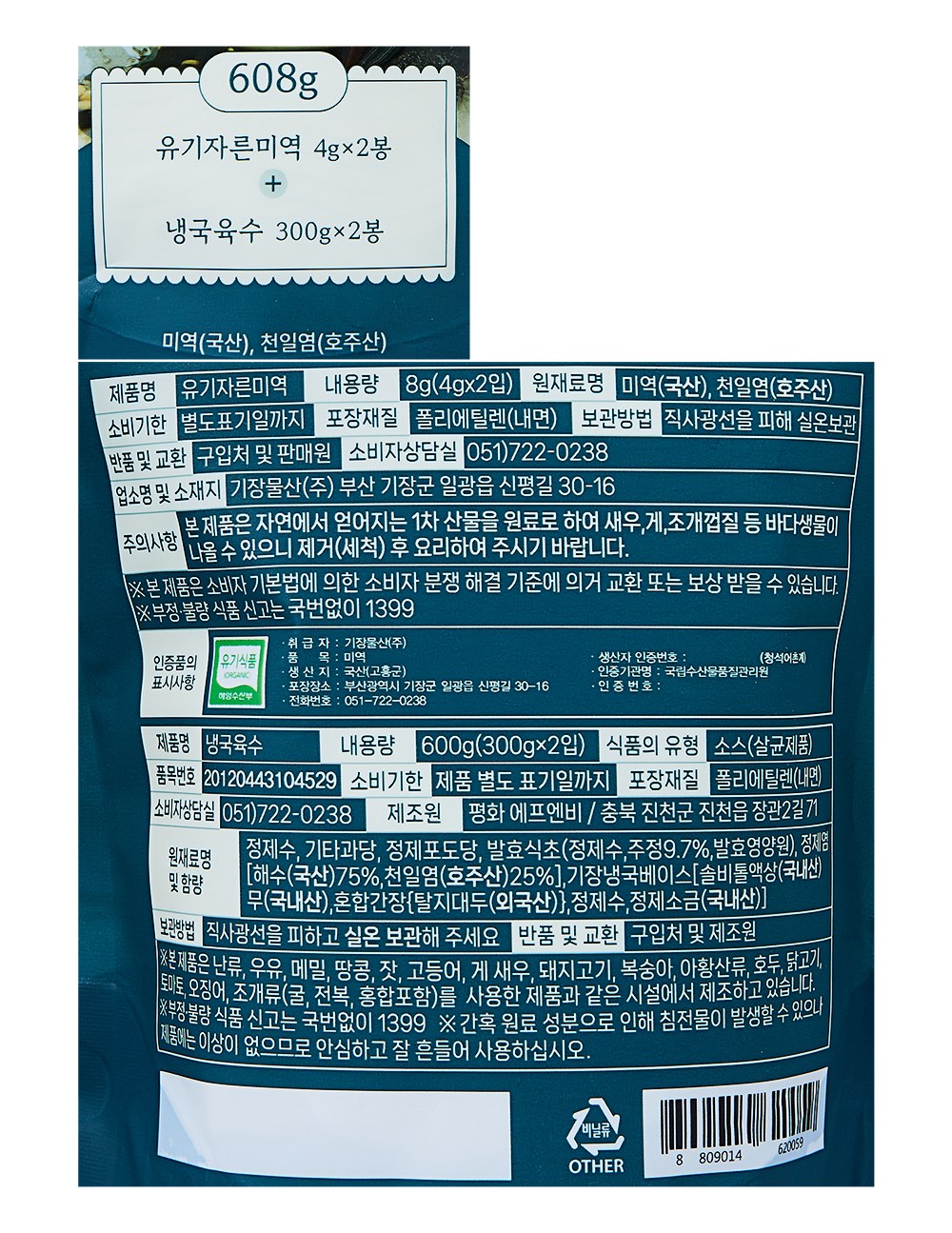 구성품 중 유기자른미역은 자연에서 얻어지는 1차 산물을 원료로 하여, 새우, 게 등 바다생물이 나올 수 있습니다. 충분히 세척 후 요리해주세요.
