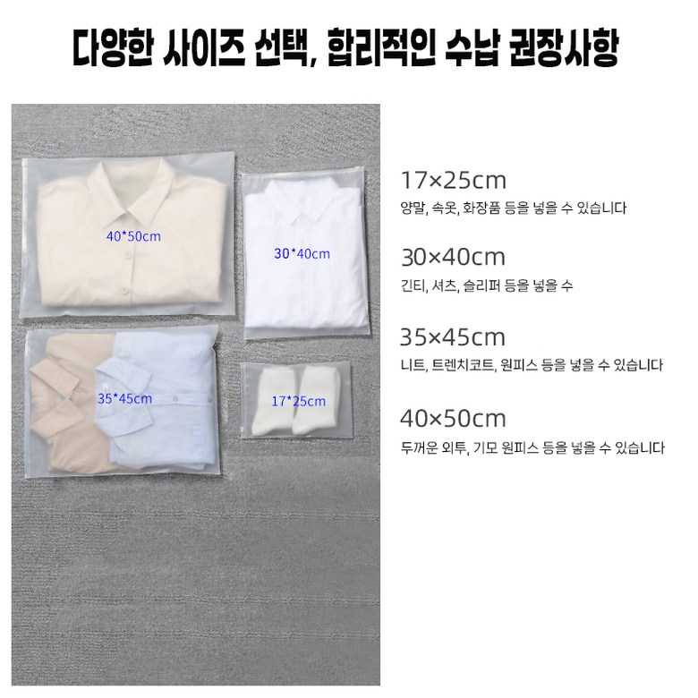 - 수량: 이 제품에는 20개의 의류 가방이 포함되어 있으며, 4가지 사양을 선택할 수 있습니다. 필요에 따라 주문하십시오.