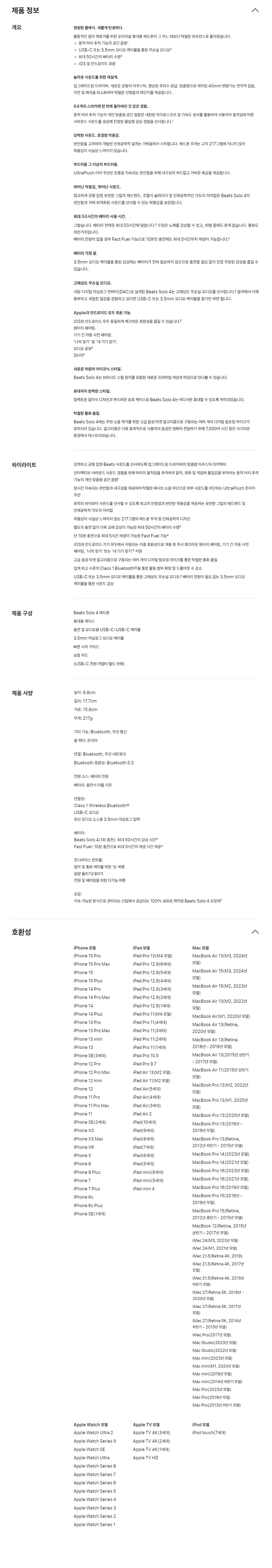 | 품명 및 모델명 | Apple Beats Solo 4 Wireless Headphones 매트 블랙 / 모델명: MUW23ZP/A / 인증모델명: A3140 | KC 인증정보 | R-C-APL-A3140 |