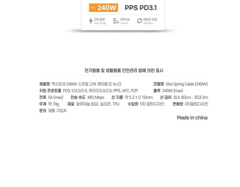 | 품명 및 모델명 | 델메이트 엑스트라 c2c 실리콘 스프링 고속 케이블 240W | 인증/허가 사항 | 해당사항없음 |