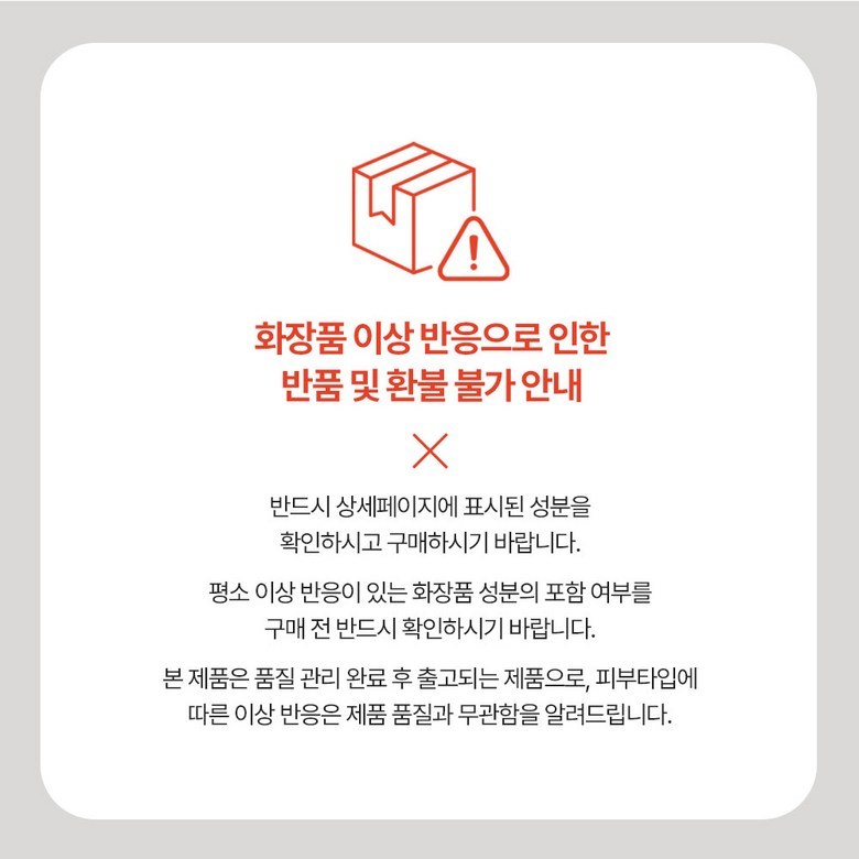| 계절상품/식품/화장품 | ㆍ신선/냉장/냉동 상품의 단순변심의 경우 ㆍ뷰티 상품 이용 시 트러블(알러지, 붉은 반점, 가려움, 따가움)이 발생하는 경우, |