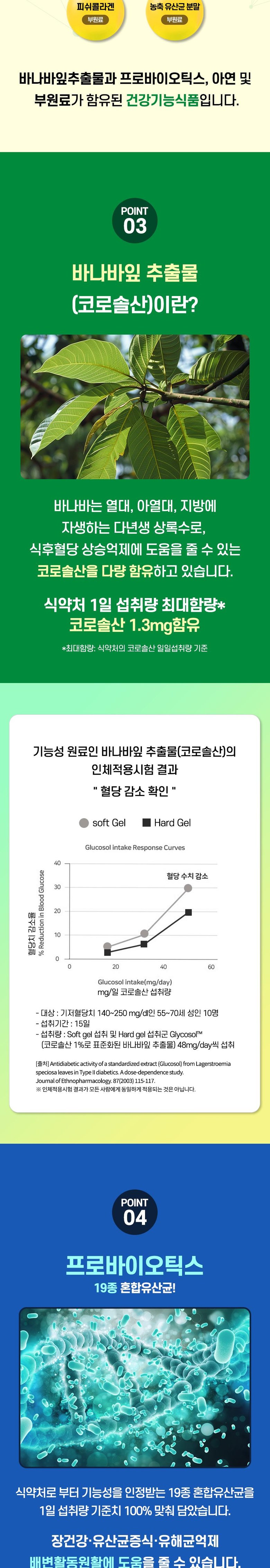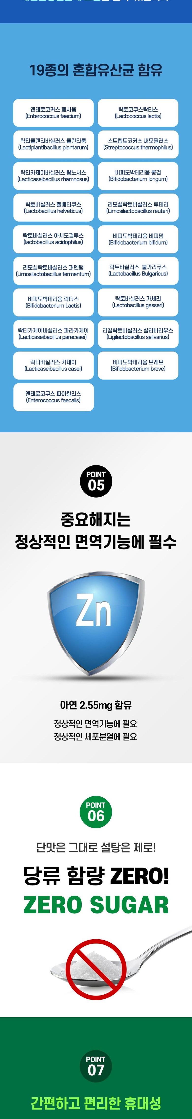 | 원료명 및 함량 | 19종혼합유산균,바나바잎추출물(인도산),산화아연,D-소비톨,이소말트,당류제로식물성크림혼합분말[폴리그리시톨시럼,식물성경화유지(코코넛유(외국산:인도네시아,필리핀,말레이시아 등)),농축우유단백분말(뉴질랜드산),제이인산칼륨,폴리인산칼륨,스테아릴젖산나트륨,제삼인산칼슘,효소처리스테이바,글리세린지방산에스테르],이산화규소,향료(요구르트분말향).피쉬콜라겐,밀크분말향혼합제제(코코넛유,변성전분,덱스트린,합셩향로,정제가공유지,프로필렌글리콜,비타민E,식물성분해단백)우유,대두 함유 | 영양정보 | 1일 영양성분 기준치에 대한 비율 열량 10kcal 탄수화물 2g 1%, 당류 0g, 단백질 0g 0%, 지방 0g 0%, 나트륨 0mg 0%,코로솔산 1.3mg, 프로바이오틱스수 1억 CFU,아연 2.55mg 30% |