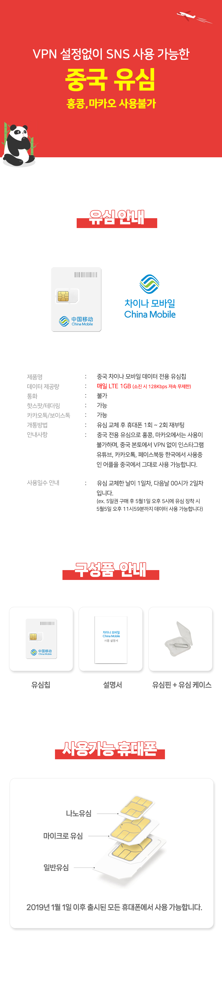 | 품명 및 모델명 | 차이나모바일 중국 VPN 필요없이 SNS 사용가능 유심칩 | 인증/허가 사항 | 해당없음 |