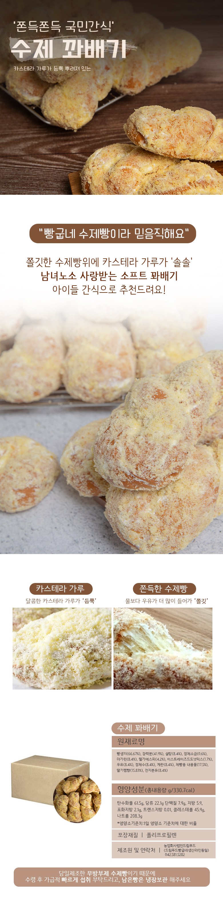| 생산자 및 소재지 | 농업회사 법인 드림푸드 (드림푸드 빵굽네 생산라인 같음) / 대전광역시 서구 언목재길 387 | 제조연월일, 소비기한 또는 품질유지기한 | ★ 주문 제작 상품으로 상시제조★ 유통기한 - 하절기 6월~9월 제조 후 5일 / 동절기 10월 ~5월 제조 후 7일 [냉장보관시 표시된 유통기한 더하기(+) 2~3일] |