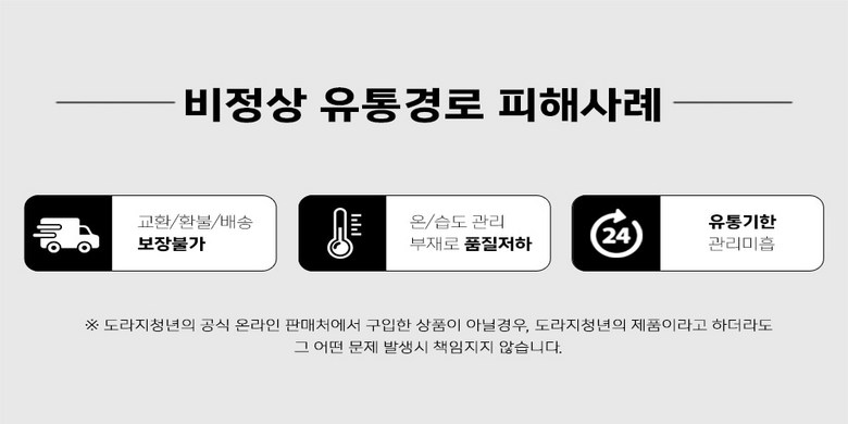 | 교환/반품 신청 기준일 | ㆍ단순변심에 의한 교환/반품은 제품 수령 후 7일 이내까지, 교환/반품 제한사항에 해당하지 않는 경우에만 가능 (배송비용과 교환/반품 비용 왕복배송비 고객부담) ㆍ상품의 내용이 표시·광고의 내용과 다른 경우에는 상품을 수령한 날부터 3개월 이내, 그 사실을 안 날 또는 알 수 있었던 날부터 |