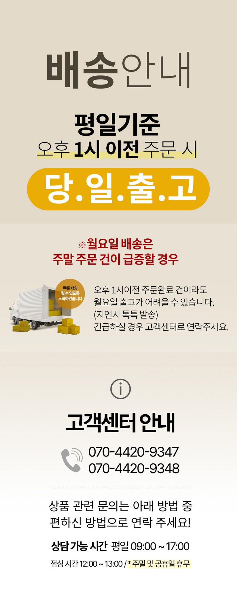 | 배송기간 | ㆍ도서산간 지역 등은 배송에 3-5일이 더 소요될 수 있습니다. - 천재지변, 물량 수급 변동 등 예외적인 사유 발생 시, 다소 지연될 수 있는 점 양해 부탁드립니다. | ||