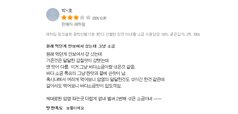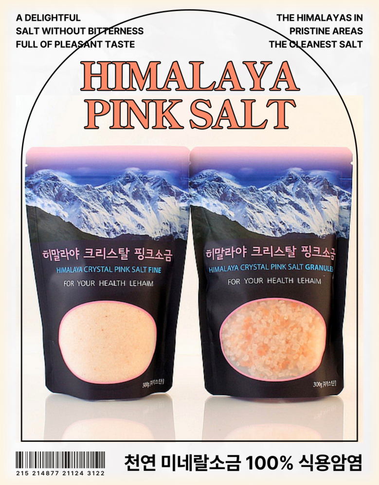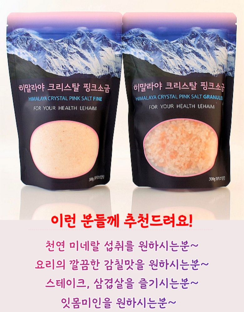 | 품목 또는 명칭 | 레하임 히말라야 크리스탈 핑크솔트 | 포장단위별 내용물의 용량(중량),수량,크기 | 300g,2봉, |