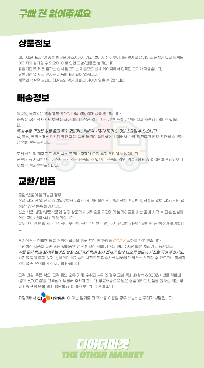 - ㆍ교환/반품에 관한 일반적인 사항은 판매자가 제시사항보다 관계법령이 우선합니다.