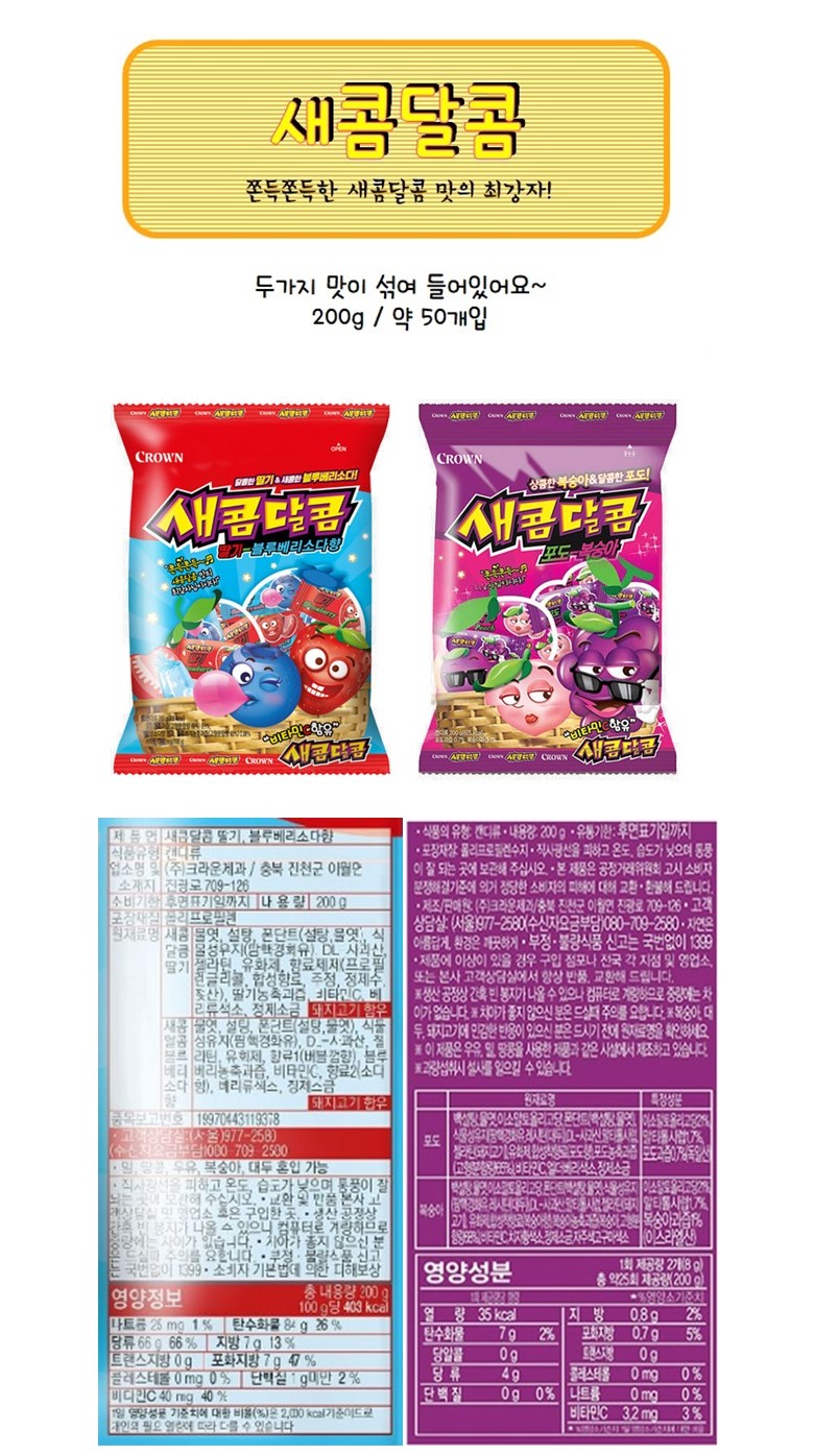 | 제품명 | 새콤달콤 포도,복숭아 | 식품의 유형 | 캔디류 |