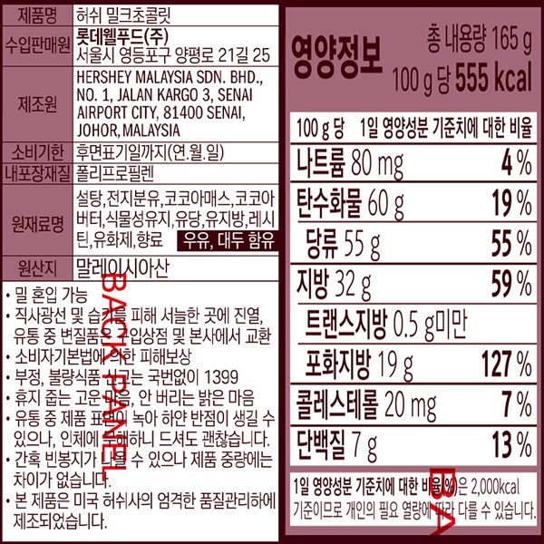 | 제품명 | 허쉬 밀크초콜릿 | 식품의 유형 | 밀크초콜릿 |