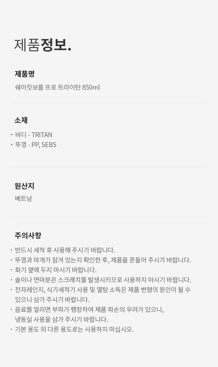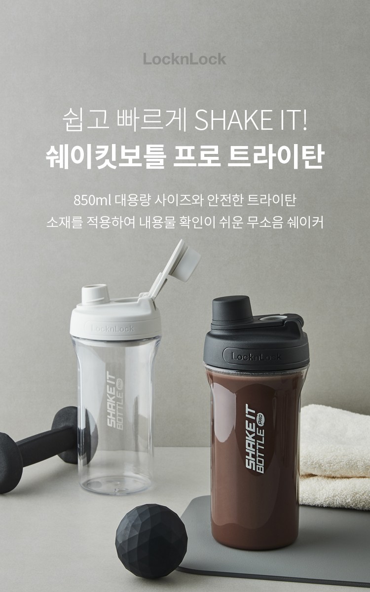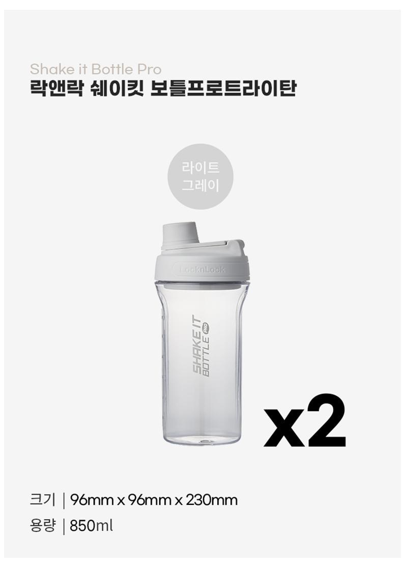 | 품명 및 모델명 | 락앤락 쉐이킷보틀프로트라이탄 850ML 2P LGRY (HPI944LGRYS2) | 재질 | 바디: TT / 뚜껑: PP+SEBS |