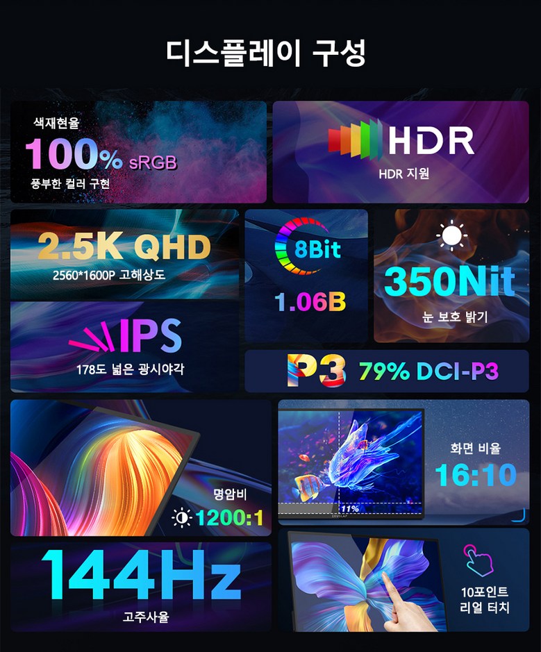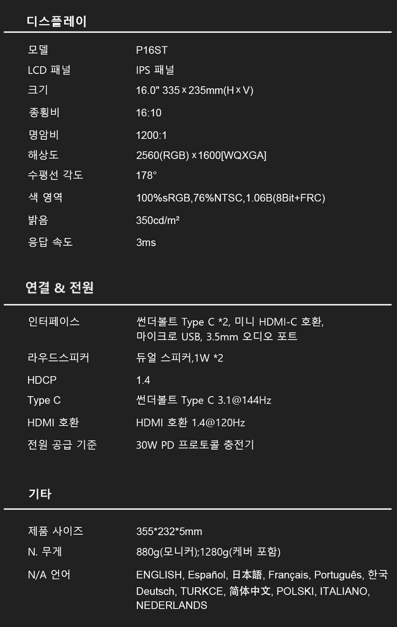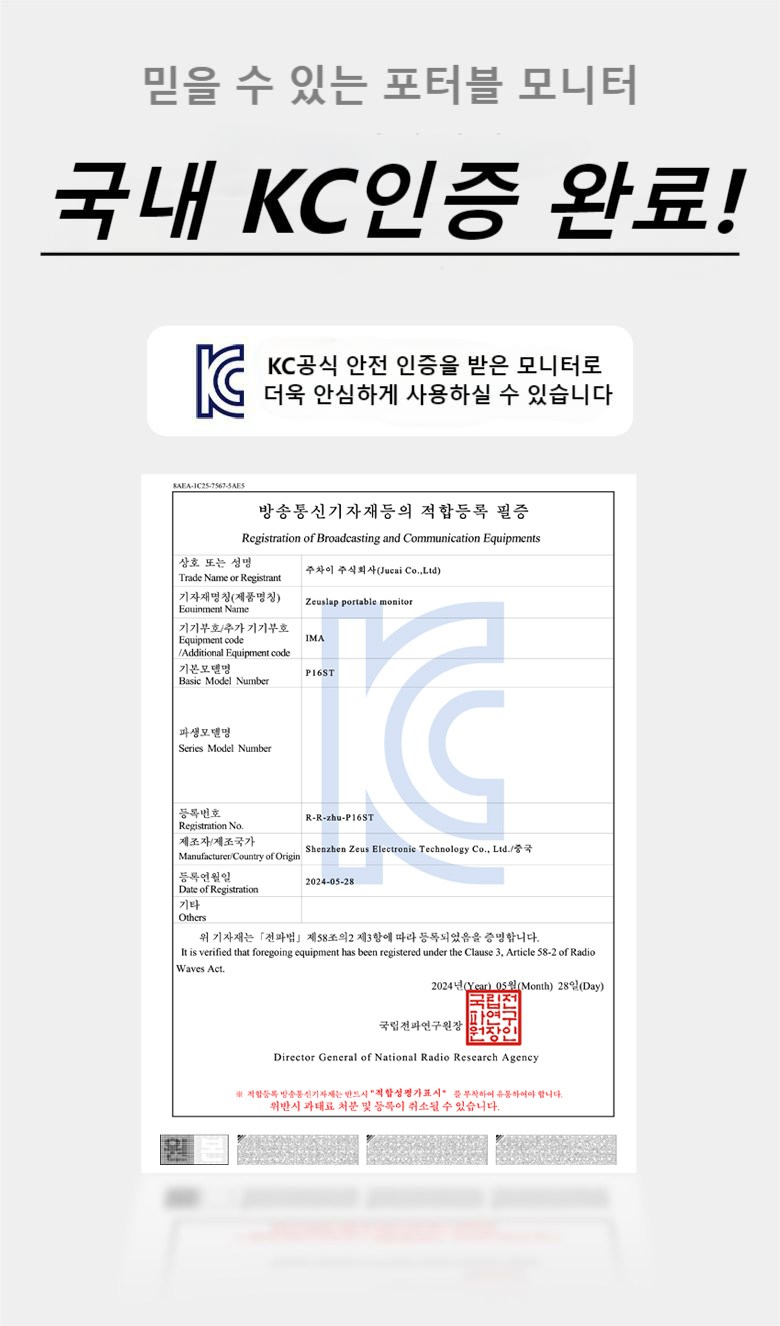 | 품명 및 모델명 | 제우스랩 P16ST 16인치 144Hz QHD 터치식 포터블 모니터 | KC 인증정보 | R-R-zhu-P16ST |
