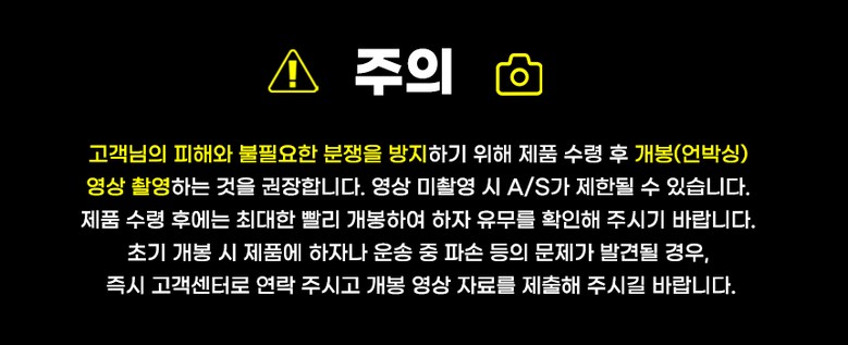 | 교환/반품 신청 기준일 | ㆍ단순변심에 의한 교환/반품은 제품 수령 후 7일 이내까지, 교환/반품 제한사항에 해당하지 않는 경우에만 가능 (배송비용과 교환/반품 비용 왕복배송비 고객부담) ㆍ상품의 내용이 표시·광고의 내용과 다른 경우에는 상품을 수령한 날부터 3개월 이내, 그 사실을 안 날 또는 알 수 있었던 날부터 |