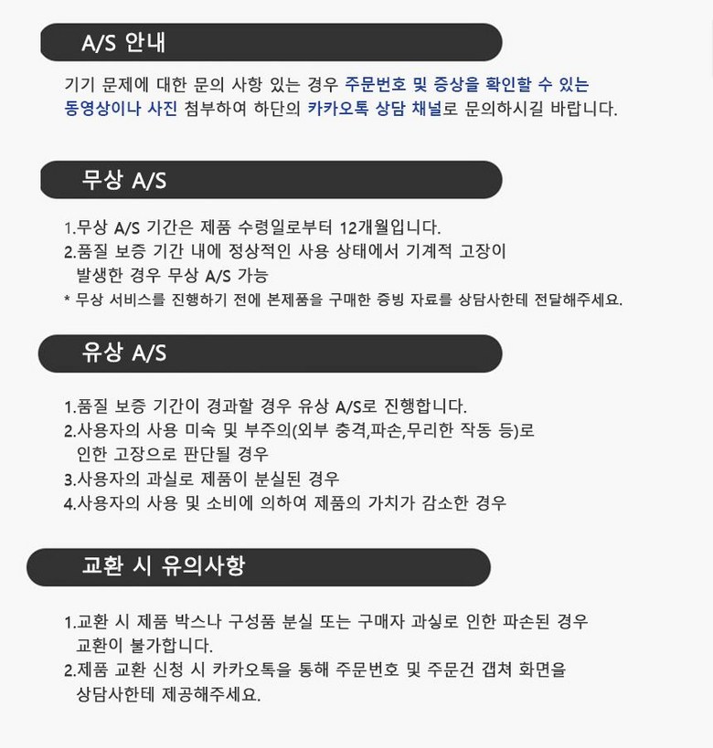 - ㆍ제조사의 사정 (신모델 출시 등) 및 부품 가격 변동 등에 의해 무료 교환/반품으로 요청하는 경우