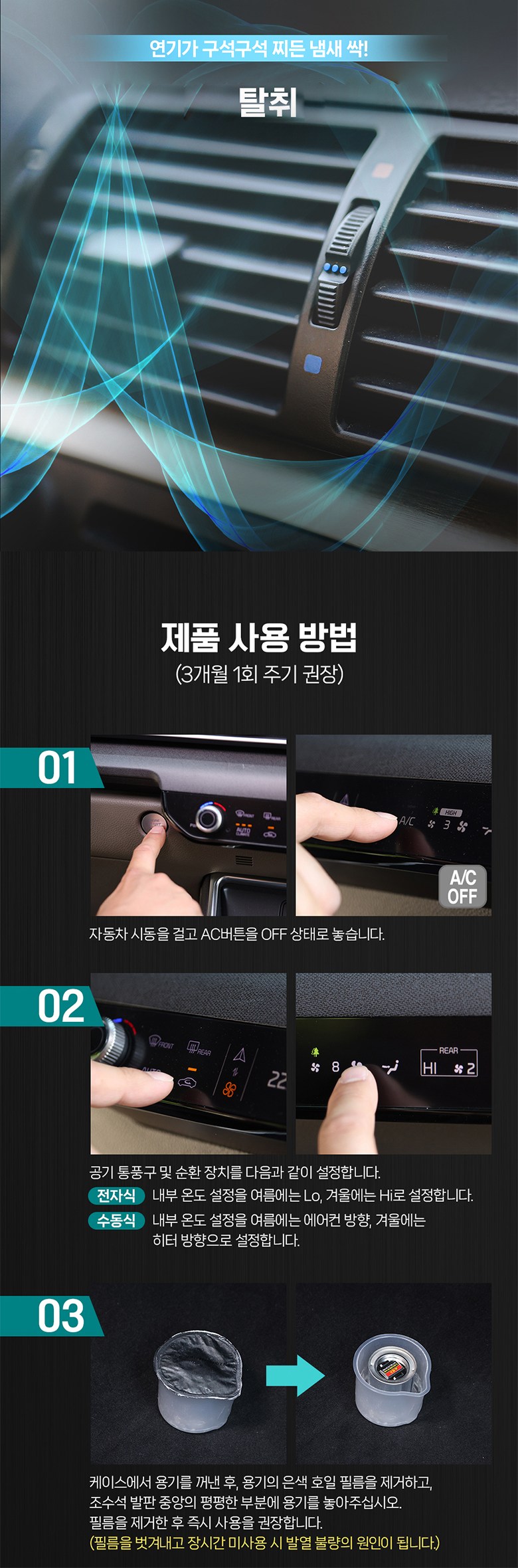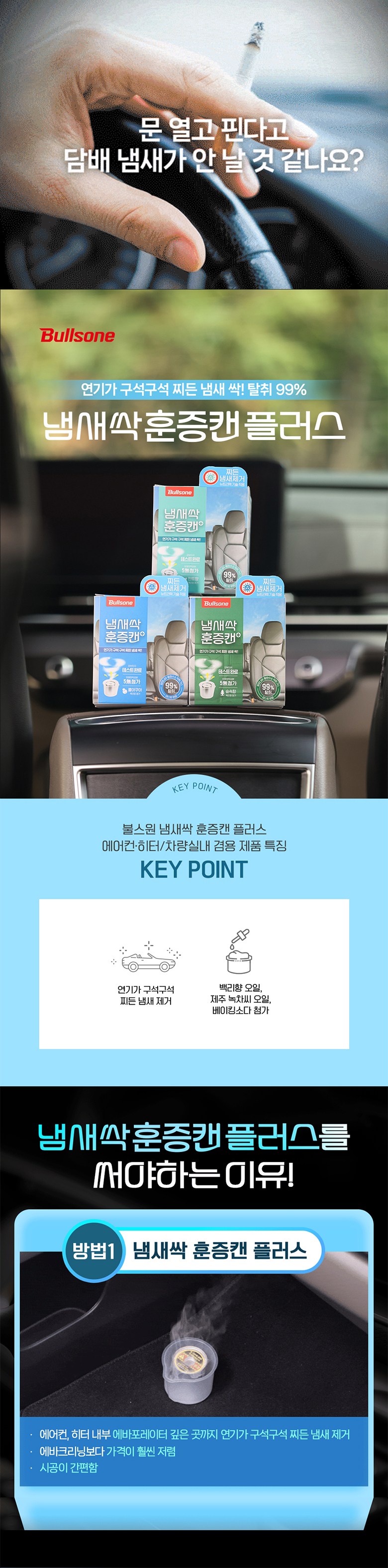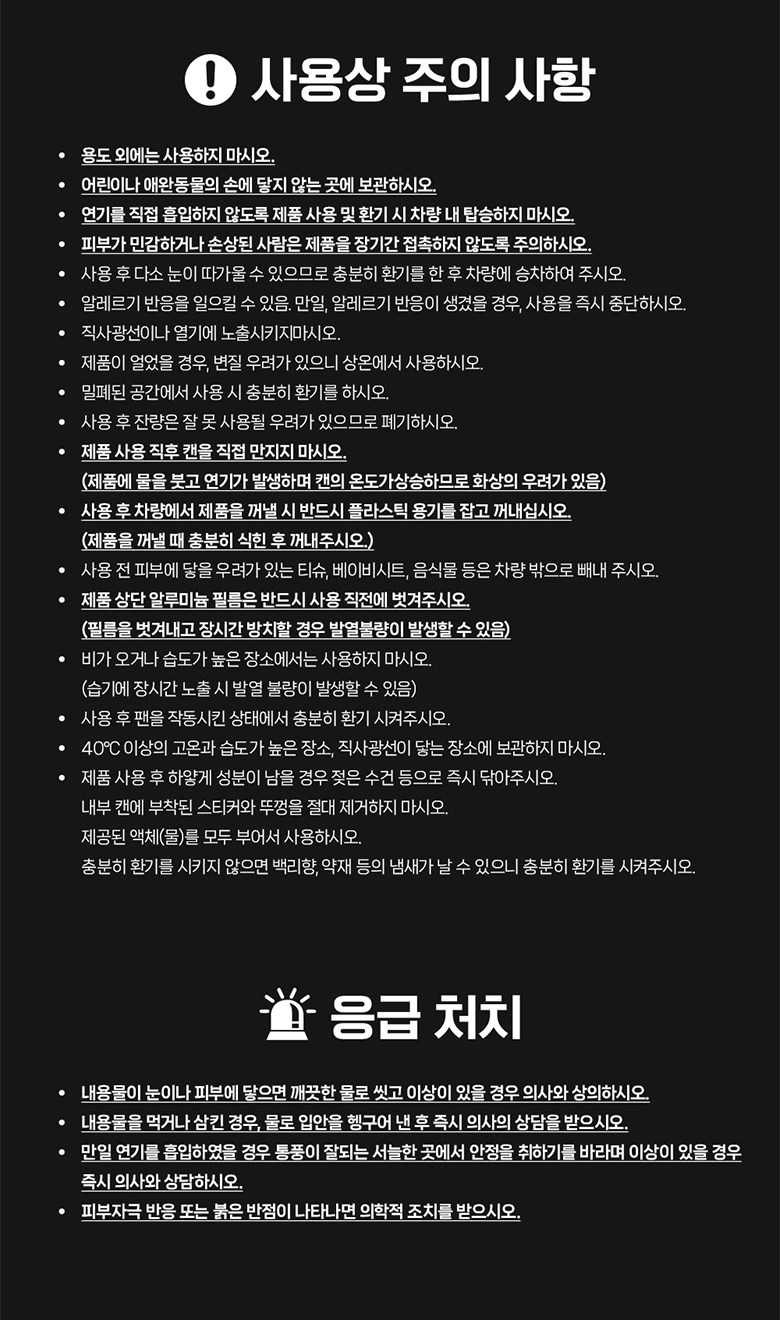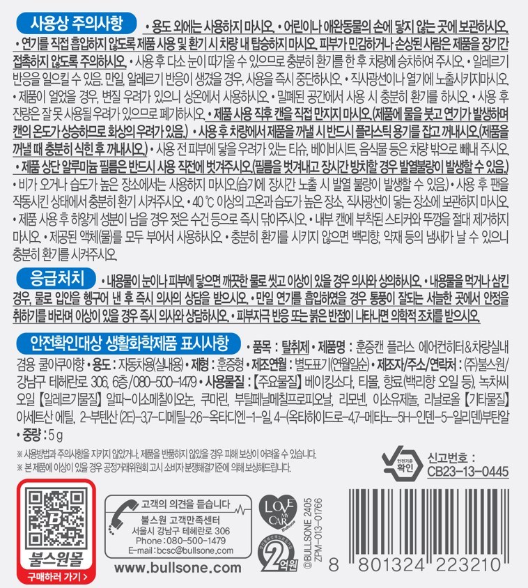 | 품목 및 제품명 | 탈취제 / 훈증캔 플러스 에어컨히터&차량실내 겸용 쿨아쿠아향 | 용도(표백제의 경우 계열을 함께표시) 및 제형 | 자동차용(실내용) / 훈증형 |