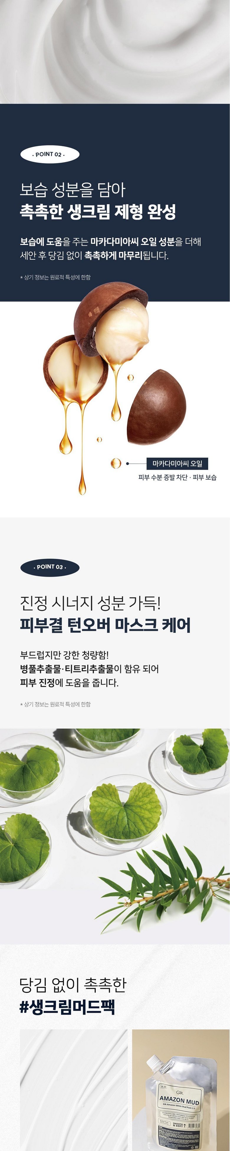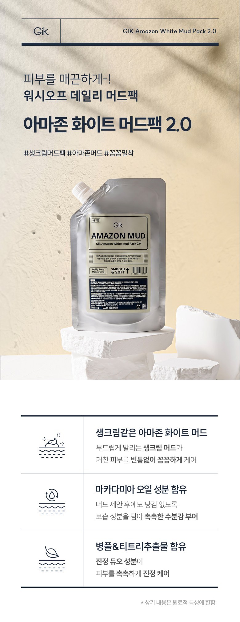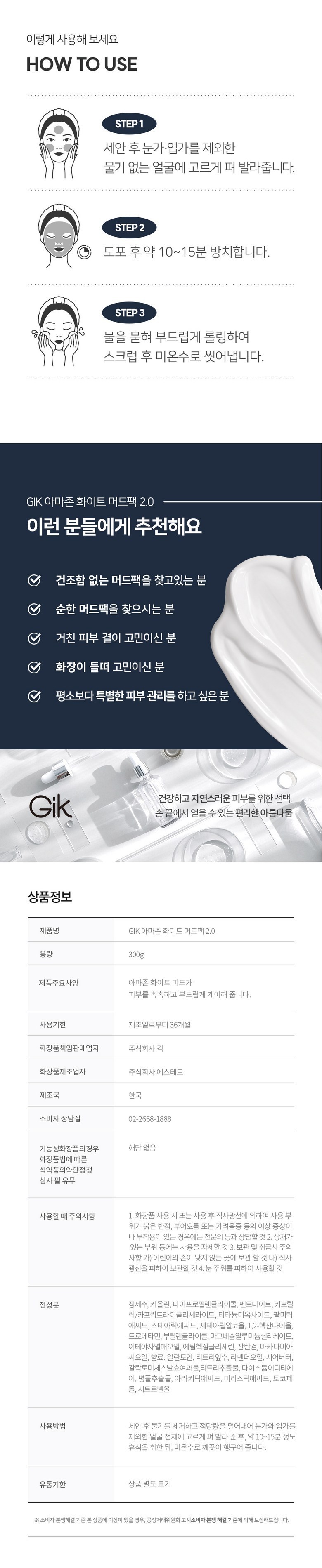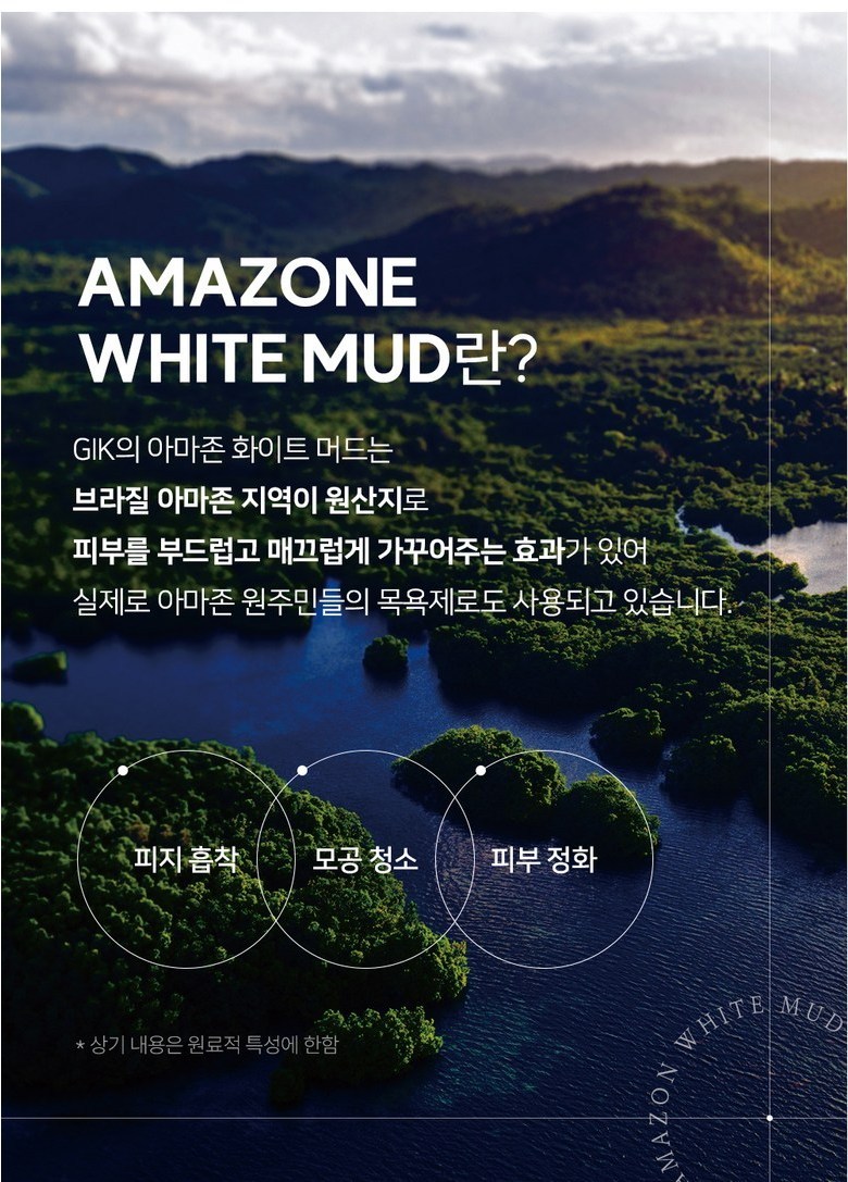 | 용량(중량) | 300g | 제품 주요 사양 | 아마존 화이트 머드가 피부를 촉촉하고 부드럽게 케어해 줍니다. |