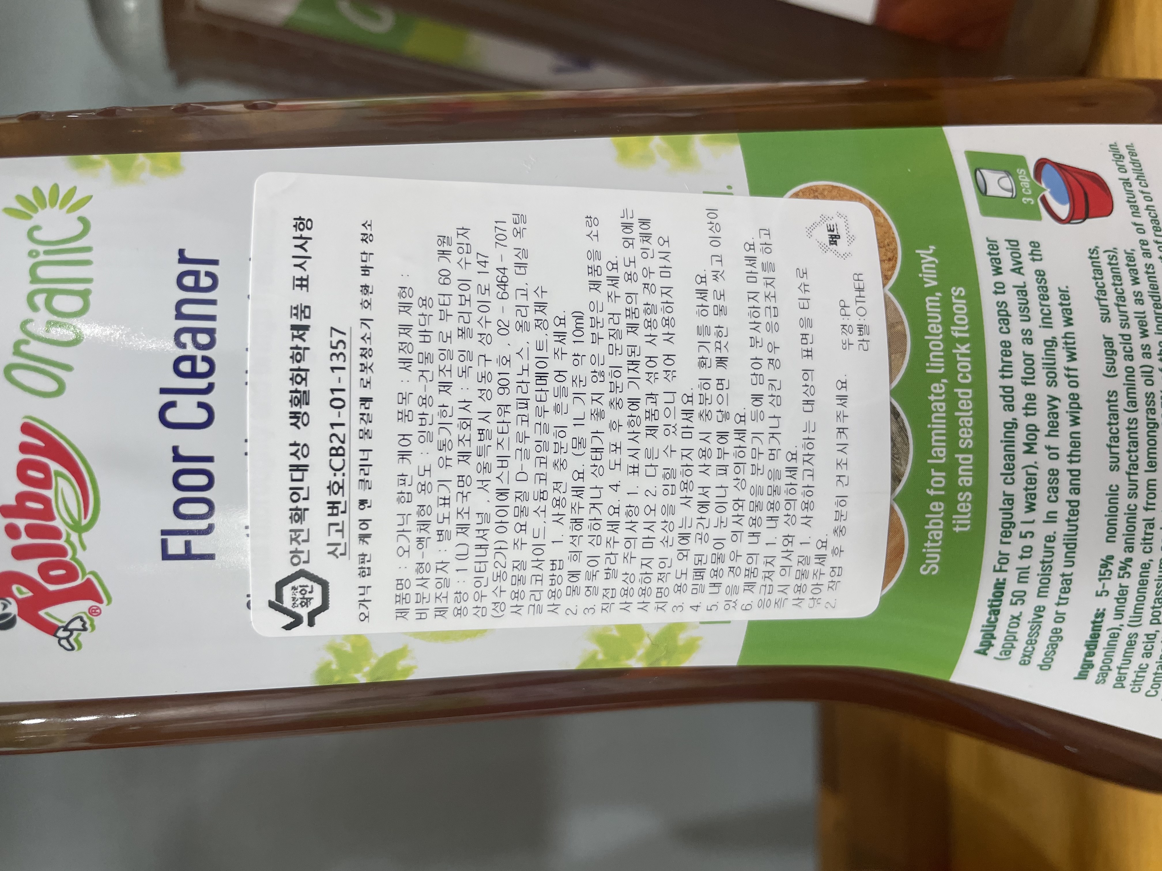 | 품목 및 제품명 | 세정제/오가닉 합판 케어 | 용도(표백제의 경우 계열을 함께표시) 및 제형 | 일반용-건물 바닥용-/비분사형-액체형 |