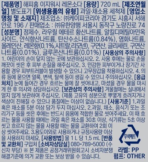 | 품명 및 모델명 | 해피홈 이지워시 레몬소다 | 인증/허가 사항 | 위생용품 |