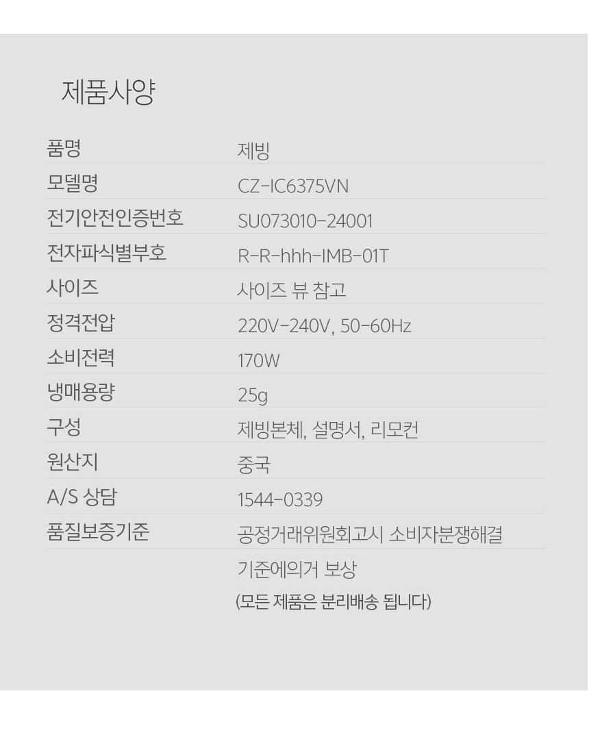 | 품명 및 모델명 | 대웅모닝컴 제빙기 화이트 / CZ-IC6375VN | KC 인증정보 | SU073010-24001, R-R-hhh-IMB-01T |