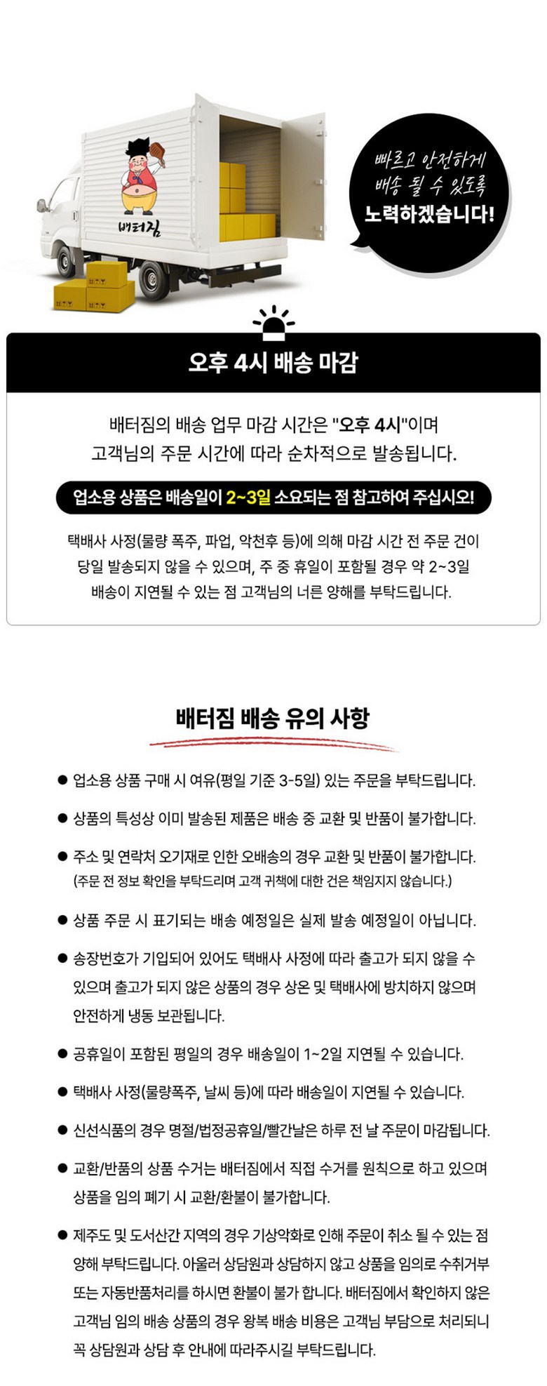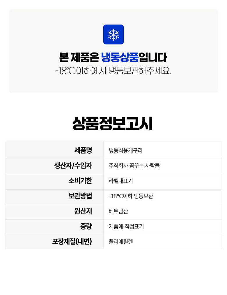| 배송방법 | 신선/냉장/냉동 | 배송비 | 무료배송 · 도서산간 추가 배송비 - 제주 지역: 5,000원 - 도서산간 지역: 3,000원 |