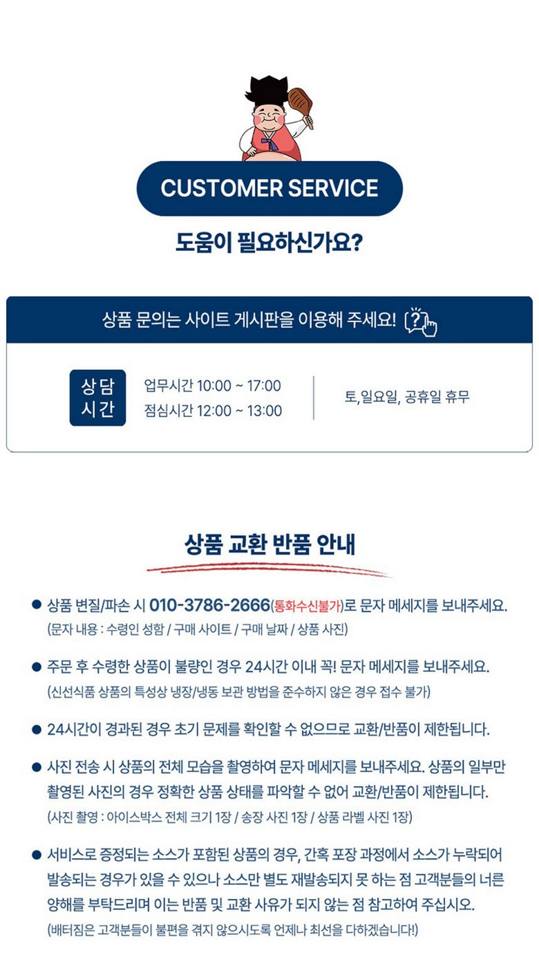 - ㆍ교환/반품에 관한 일반적인 사항은 판매자가 제시사항보다 관계법령이 우선합니다.