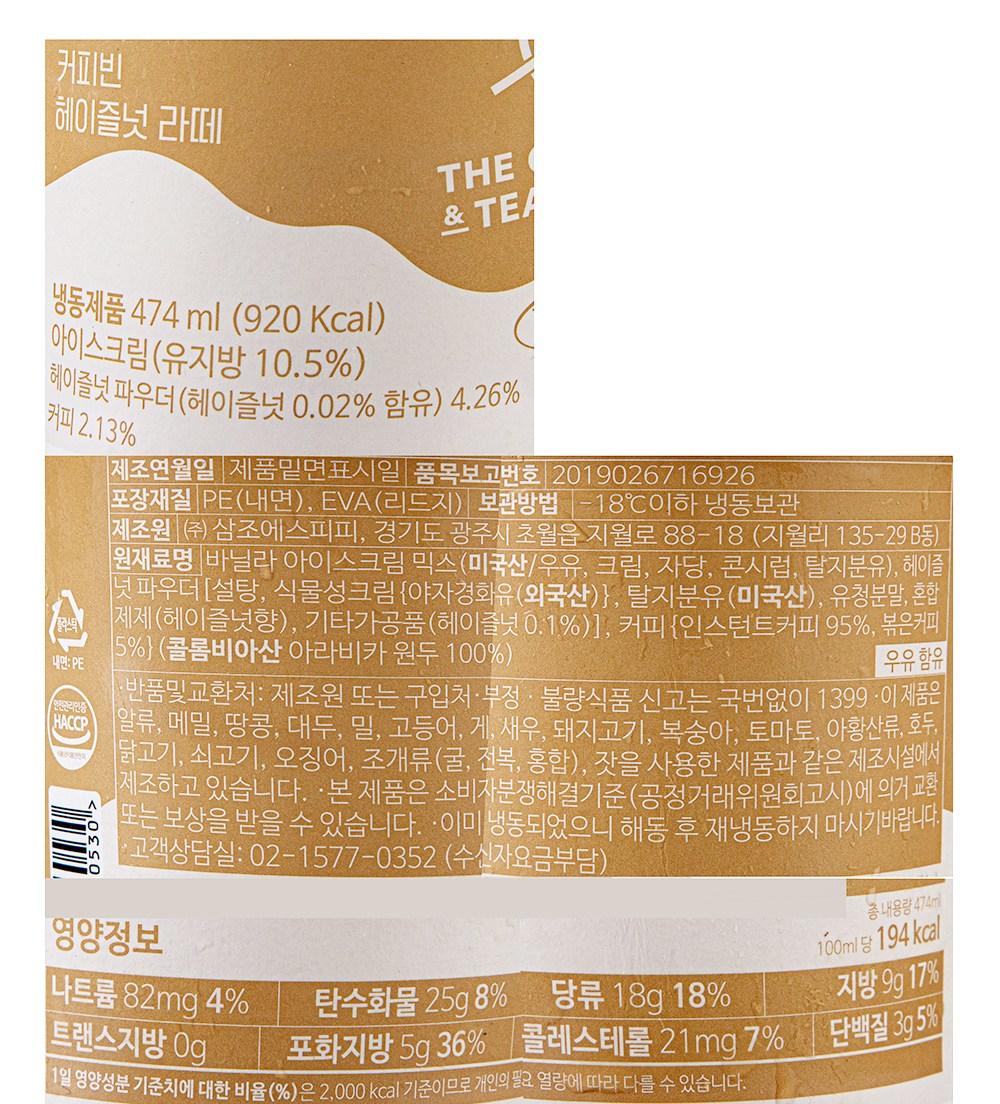 | 제품명 | 커피빈 헤이즐넛 라떼 | 식품의 유형 | 컨텐츠 참조 |